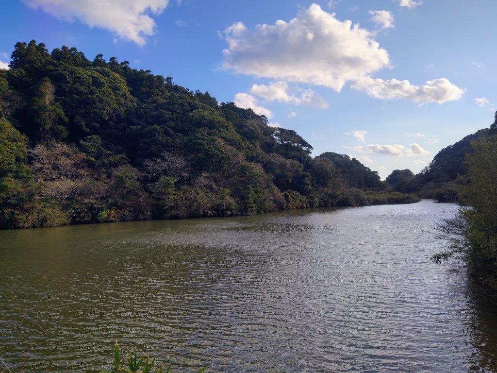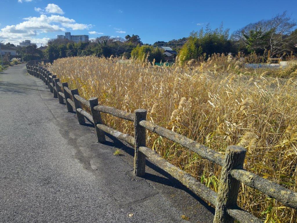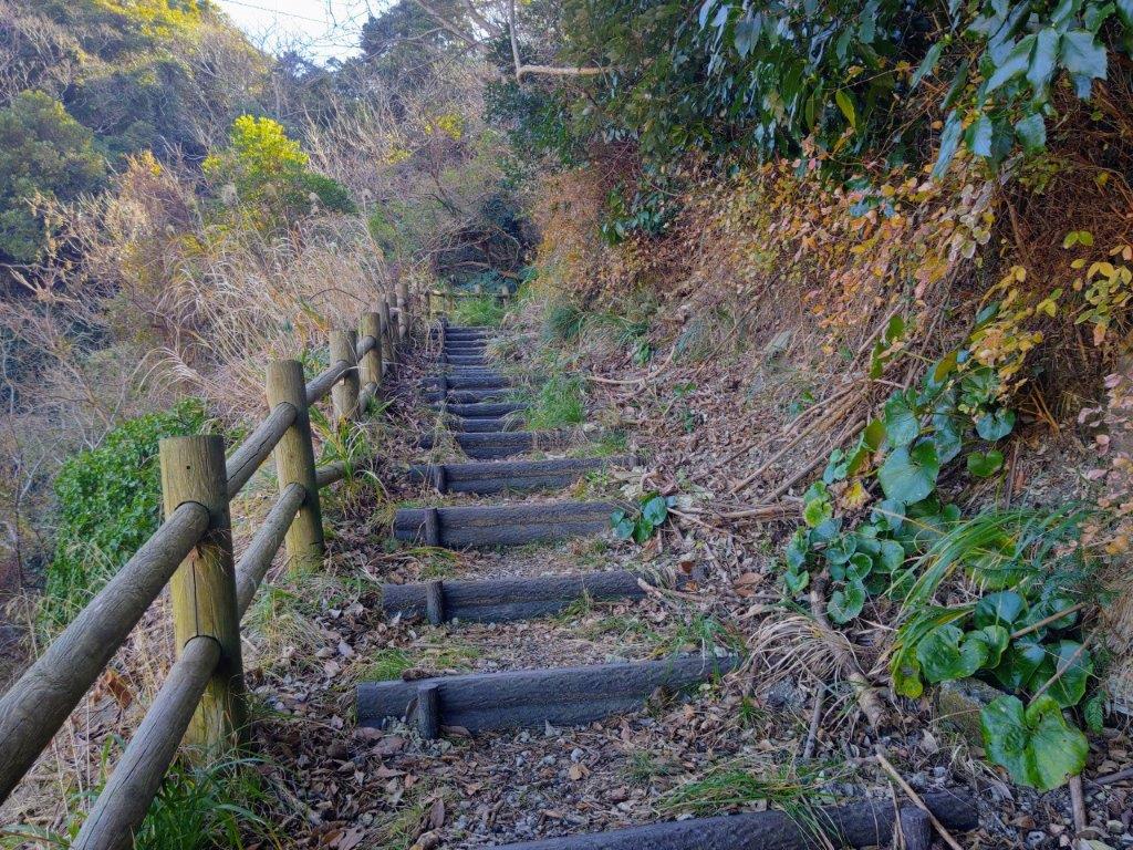 I was moved to read that Miura Anjin, whose life story I had just read, had built the ship allowing the remaining crew to continue their trip to Mexico. It was a little past noon so I decided to stop for an early lunch . Afterwards, I headed down a road back to sea level, and turned left upon reaching a main road, following the omnipresent Kanto no Fureai Michi signposts. Around here, I came across a “kyon“, a kind of miniature deer, foraging for food before vanishing into the bushes. A little further, I headed down an unsignposted footpath on the right side. After a 5-minute walk next to a bubbling brook, the surrounding view mostly blocked by tall grasses, I arrived at Ohazuki Coast (大波月海岸) one of the hidden beaches on today’s hike.