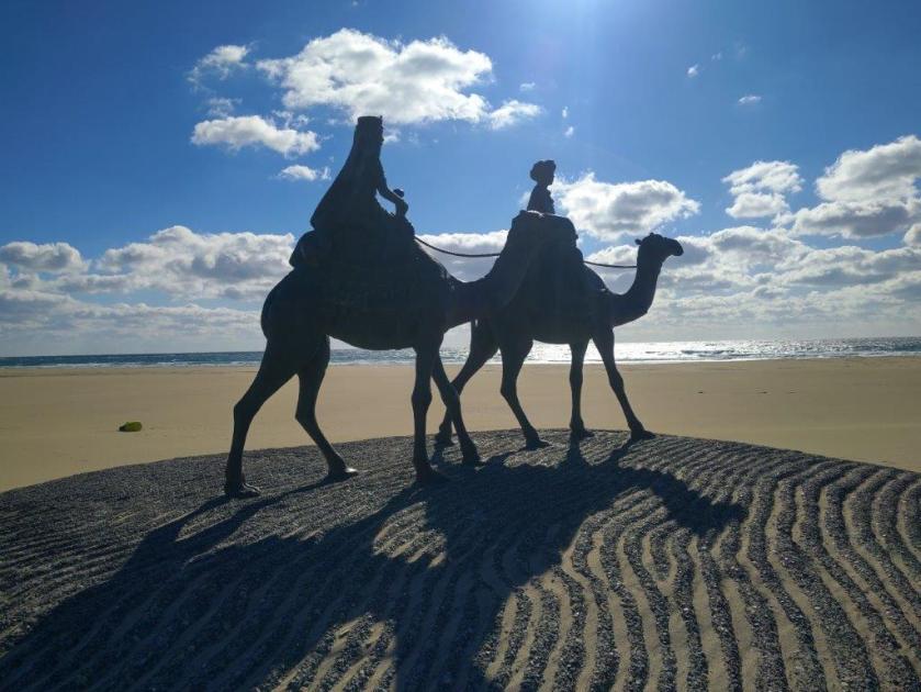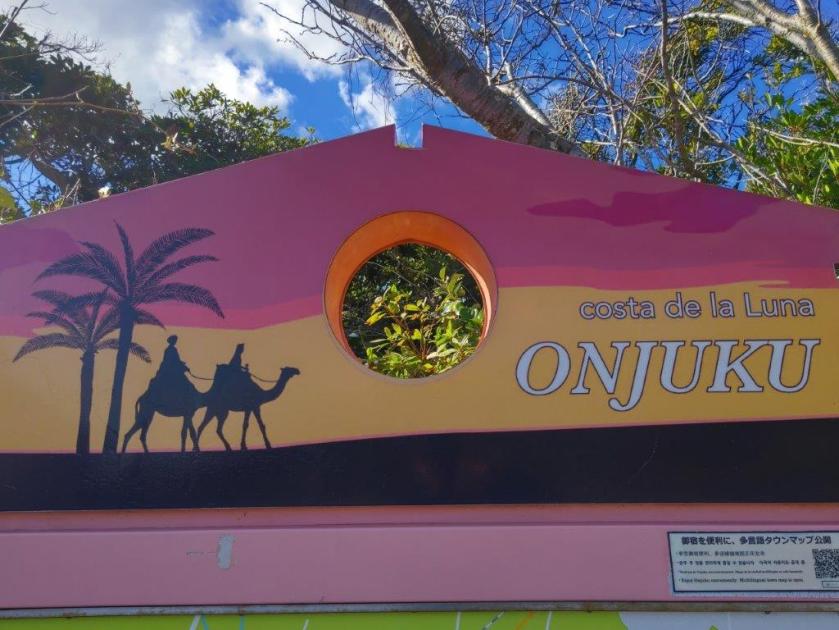 It was a blue sky day as I rode the limited express through the Chiba countryside, arriving at Onjuku station a little before 10h30. After walking alongside the Shimizu river, partly hidden by swaying pampa grass, for 15 minutes, I reached the start of the sand dunes and spotted two camels up ahead. I thought it was a mirage but upon getting closer, I realised it was actually two statues, called “Tsuki no Sabaku” (月の砂漠 “Desert of the Moon”). As I approached, the wide sandy expanse of Onjuku Beach came into view.
