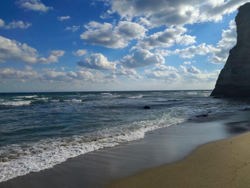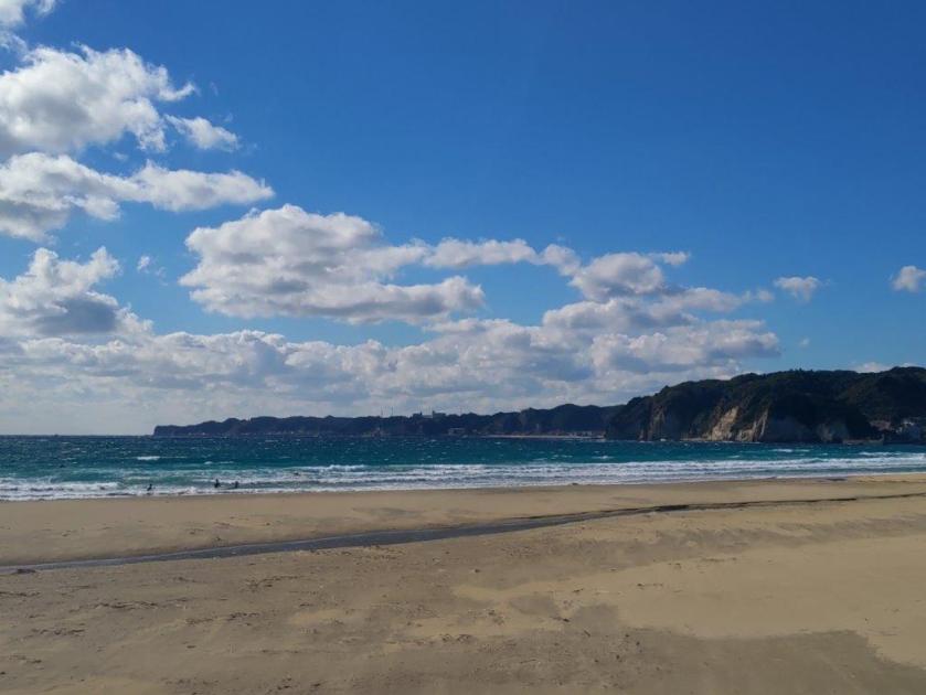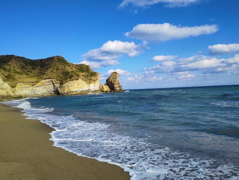 I was looking for a low elevation hike for a cold winter day. I decided to continue last year’s hike along the Fureai no Michi on the Pacific side of the Boso Peninsula. I’d get to walk on Onjuku beach, famous for its white sands; visit the Mexican memorial commemorating a Spanish shipwreck 400 years ago; finally, check out a Buddhist temple perched above the ocean; if time allowed, I could drop by a couple of secret beaches off the main route. A popular place in summer, I hoped it would be nicely deserted in the middle of winter.