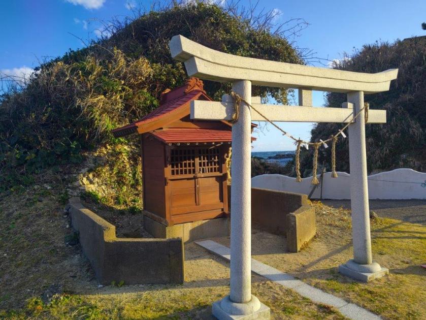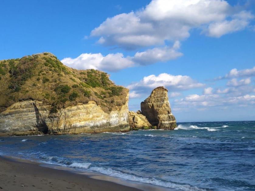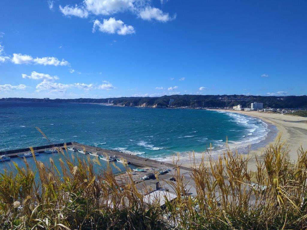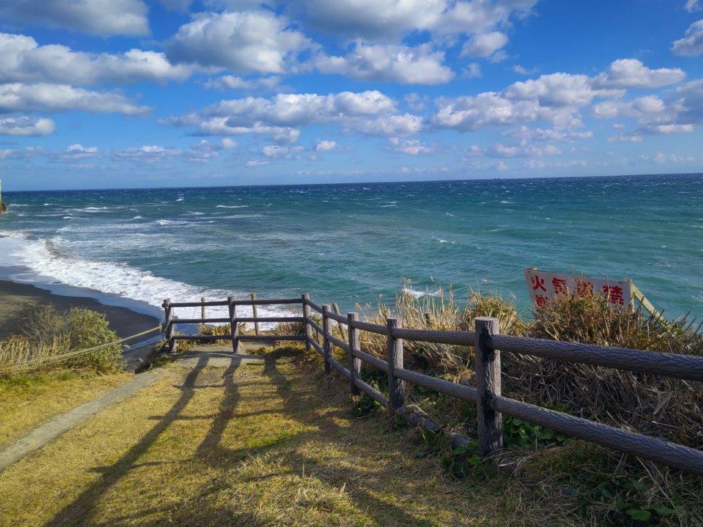 I was amazed by the fine white sand, unlike any other beach in the Tokyo area. On the far side, cliffs rose above the ocean, enclosing the curving beach within the bay. The wind was blowing so hard I had to face the other way to protect my eyes from the tiny grains of sand flying through the air. I soon arrived at Iwawada Coast (岩和田海岸). I turned left before the fishing port, leaving the coast temporarily, and followed the signs for the Mexican Memorial. Very soon, I reached some steps leading up the back of a cliff; beyond a pass, I turned right at a junction and soon reached an open shelter with a viewpoint on the west side.
