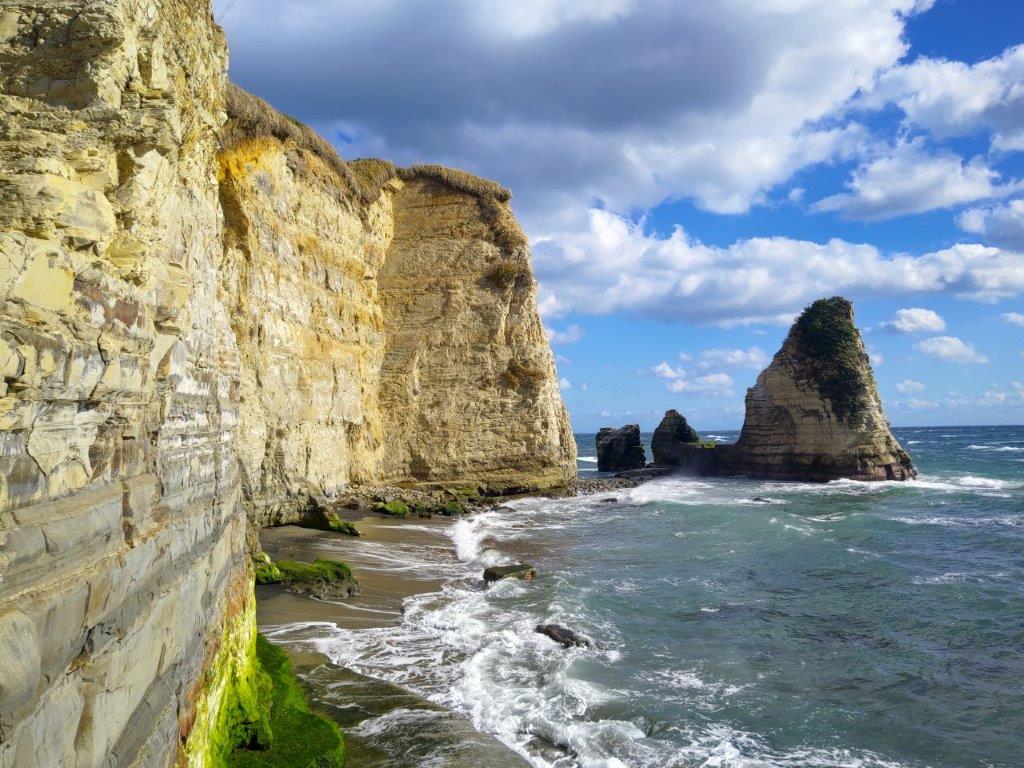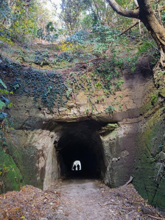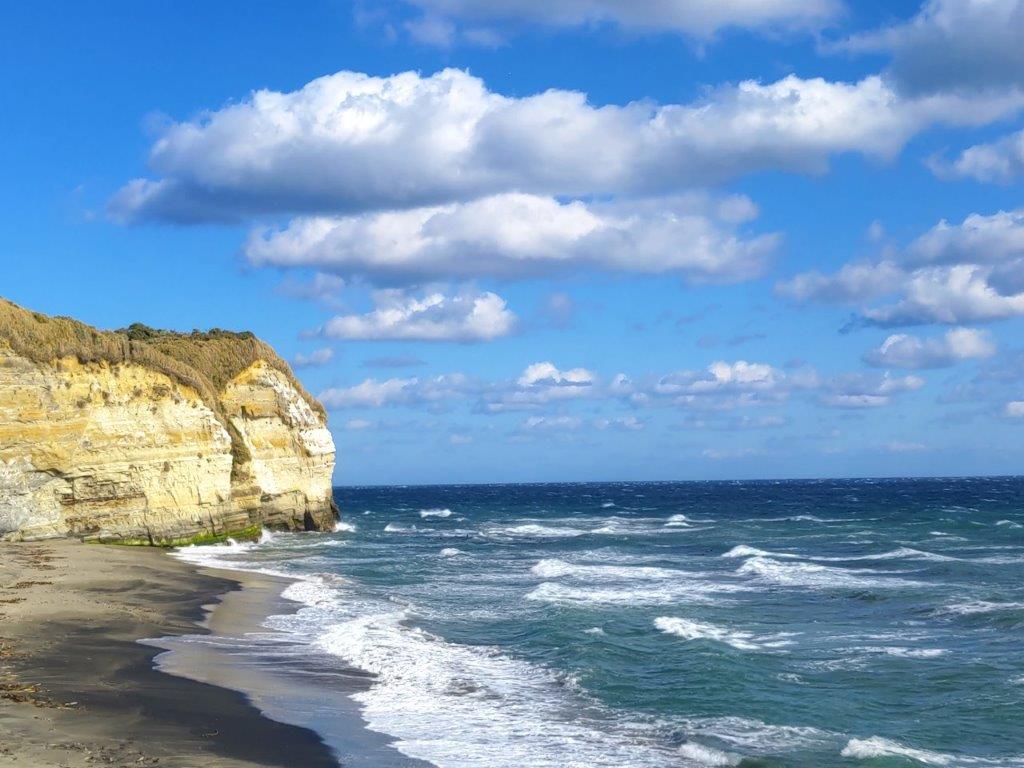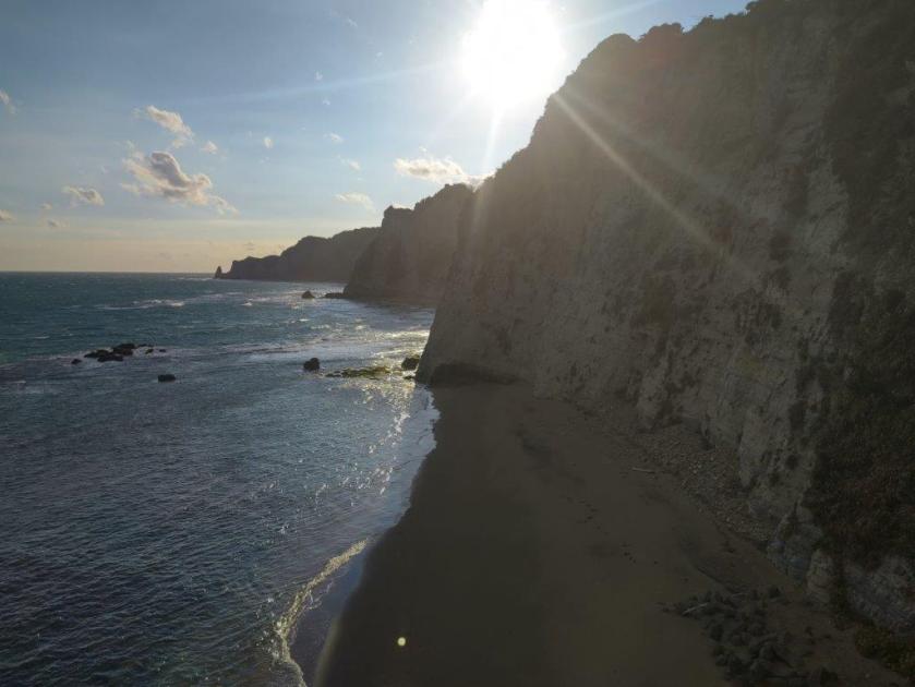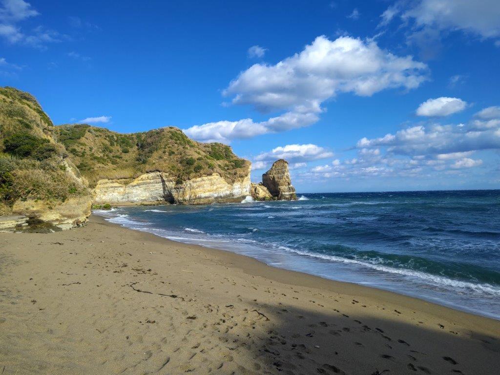 I was stunned by the view of the golden cliffs ending at Roskoku-iwa (ロウソク岩 meaning Candle Rock) in the distance. The wind was frighteningly strong so after snapping a few shots, I quickly retreated back to the road. A little later, I reached the actual spot where the ship of Don Rodrigo, who was the governor of the Philippines at the time, had landed. I took a moment to imagine the shipwreck rescue scene before moving on. Just a little further, I reached the entrance path for the second hidden beach of the day. After a 10-minute walk, including a spooky passage through a dark tunnel, I reached Koura Coast (小浦海岸), a wide beach framed by cliffs on each side.