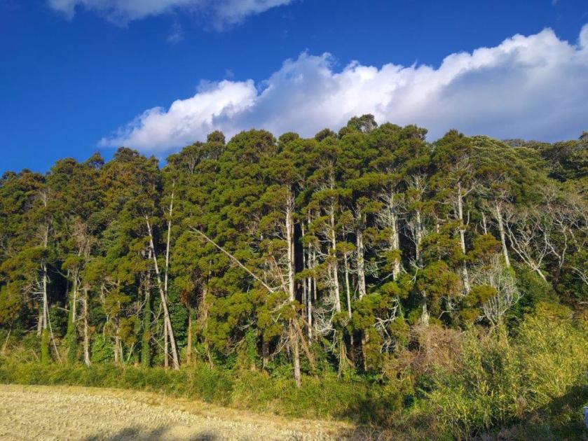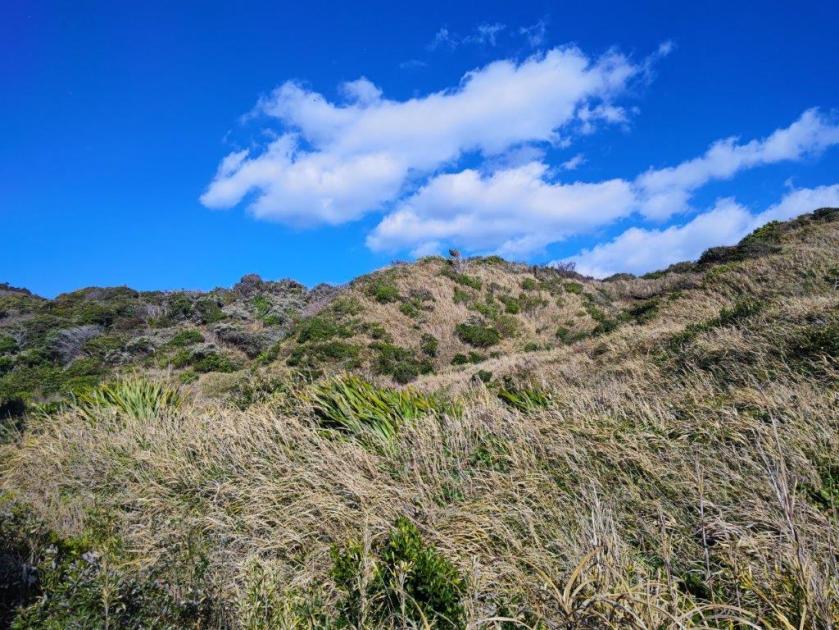 I was impressed by the unexpected view of the yellow bluffs topped with green bushy vegetation, the colours enhanced by the sun, already low in the sky; they extended northwards, ending at solitary Notto no Hana (ノットの鼻) rock. . I took a moment to enjoy the sound of crashing waves and then made my way back to the main road which I then followed to the top of a hill, also the highest point of the hike. Thick vegetation on both sides meant only blue sky was visible above, although more and more clouds were fast approaching from the South. Eventually, I emerged into a charming cultivated valley and turned right onto a smaller road which led through the first of two short tunnels.