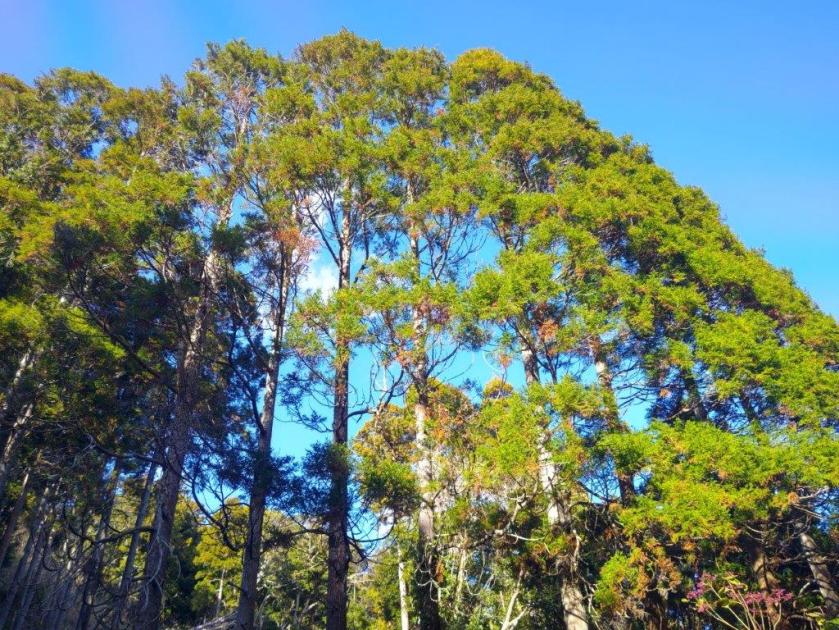 I had forgotten the first part of the trail was so narrow, hugging a steep mountainside; however, a metal railing on the valley side ensured it could be walked safely. After some ascending, I reached a metal cross at the highest point of today’s hike, also the turnoff for Mt Mutsuishi; beyond this point, the trail descended into the valley; on the way down, I had another glimpse of the Ogouchi dam through a gap in the vegetation.