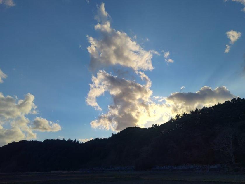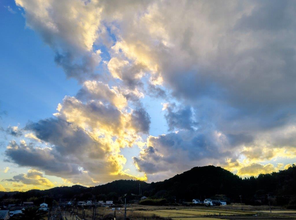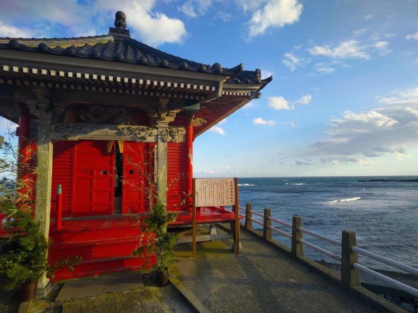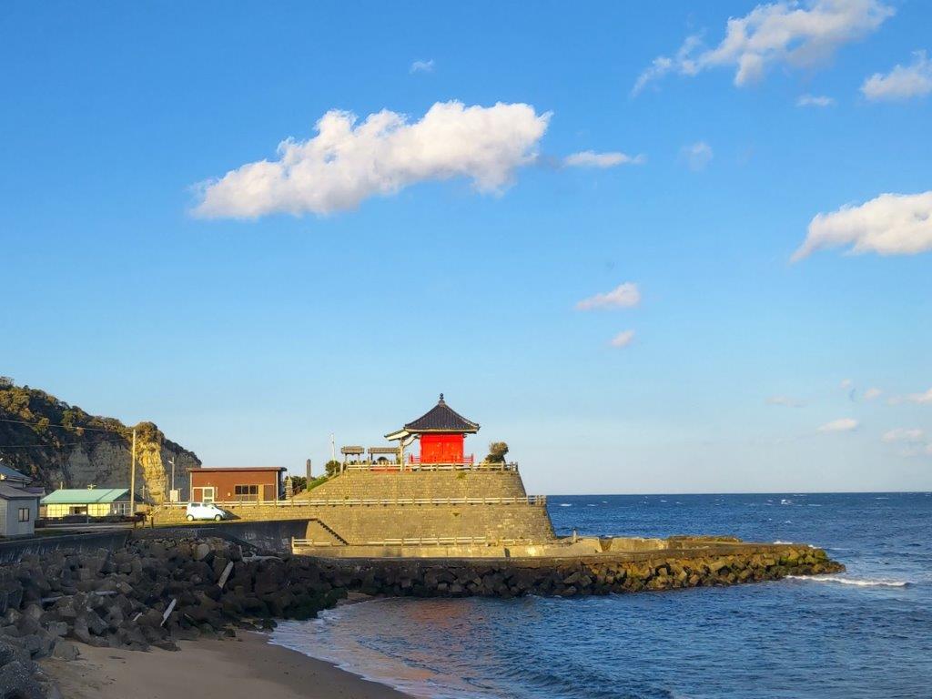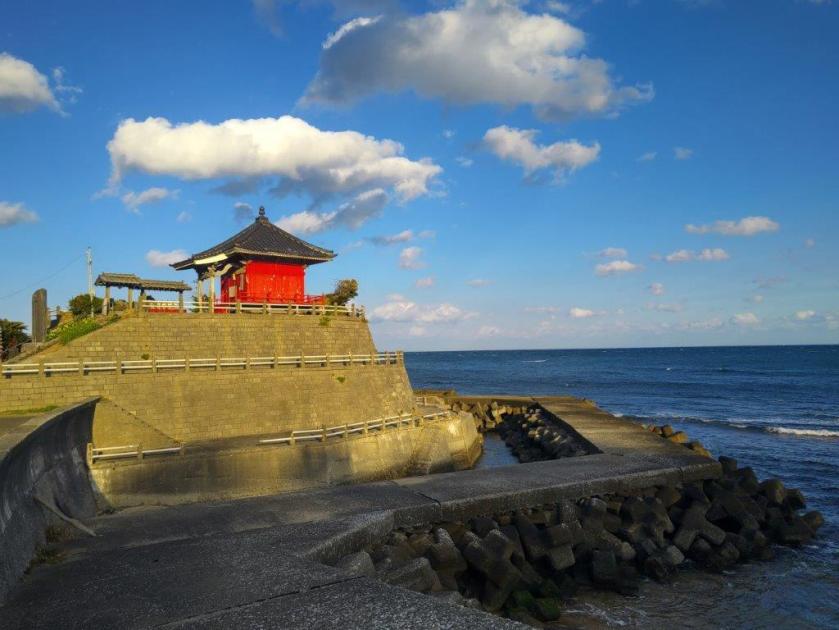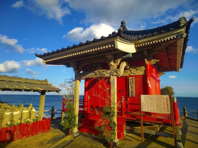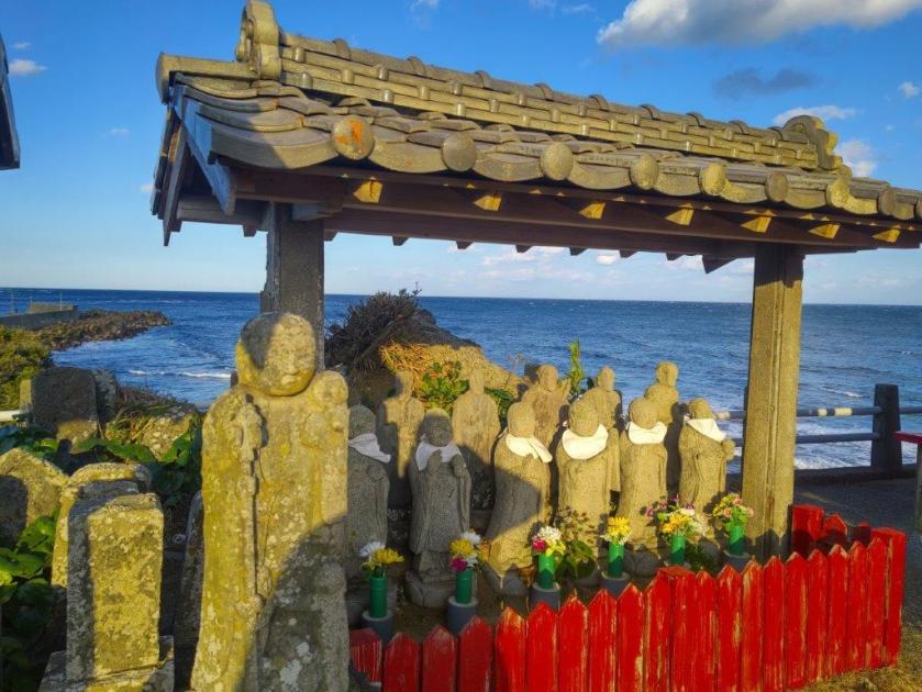I was excited to get another view of the spectacular coastline; the clouds had thankfully moved on and the afternoon light coloured the cliffs and rock islands in gold and copper. It was 3pm and I had to step up the pace to finish before sunset. Up ahead, I could soon see the red shrine building of Iwafune Jizoson (岩船地蔵尊) famous for its Jizo statues. It was a picturesque scene, the red shrine contrasting with the blue sky above. After briefly checking out the Jizo statues, I turned left at the Iwafune fishing village, following the road through a tunnel and into the valley I had first glanced near Hyotan Pond. I arrived at Namihana station at 4pm, as the sun set behind the low inland hills, illuminating the clouds in yellow and orange, a fine finish to a spectacular hike.