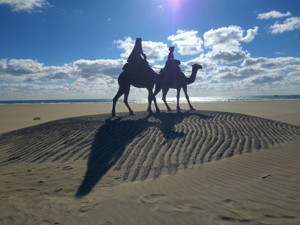 It was a blue sky day as I rode the limited express through the Chiba countryside, arriving at Onjuku station a little before 10h30. After walking alongside the Shimizu river, partly hidden by swaying pampa grass, for 15 minutes, I reached the start of the sand dunes and spotted two camels up ahead. I thought it was a mirage but upon getting closer, I realised it was actually two statues, called “Tsuki no Sabaku” (月の砂漠 “Desert of the Moon”). As I approached, the wide sandy expanse of Onjuku Beach came into view.