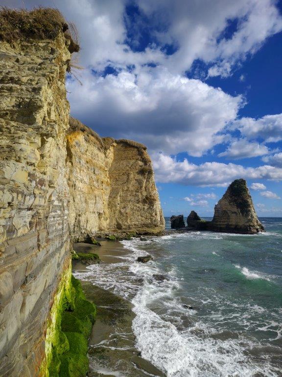 I was stunned by the view of the golden cliffs ending at Roskoku-iwa (ロウソク岩 meaning Candle Rock) in the distance. The wind was frighteningly strong so after snapping a few shots, I quickly retreated back to the road. A little later, I reached the actual spot where the ship of Don Rodrigo, who was the governor of the Philippines at the time, had landed. I took a moment to imagine the shipwreck rescue scene before moving on. Just a little further, I reached the entrance path for the second hidden beach of the day. After a 10-minute walk, including a spooky passage through a dark tunnel, I reached Koura Coast (小浦海岸), a wide beach framed by cliffs on each side.