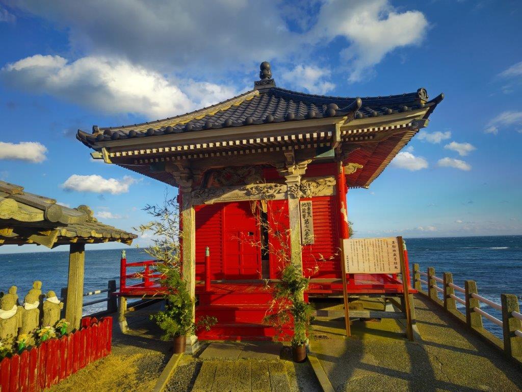 I was excited to get another view of the spectacular coastline; the clouds had thankfully moved on and the afternoon light coloured the cliffs and rock islands in gold and copper. It was 3pm and I had to step up the pace to finish before sunset. Up ahead, I could soon see the red shrine building of Iwafune Jizoson (岩船地蔵尊) famous for its Jizo statues. It was a picturesque scene, the red shrine contrasting with the blue sky above. After briefly checking out the Jizo statues, I turned left at the Iwafune fishing village, following the road through a tunnel and into the valley I had first glanced near Hyotan Pond. I arrived at Namihana station at 4pm, as the sun set behind the low inland hills, illuminating the clouds in yellow and orange, a fine finish to a spectacular hike.
