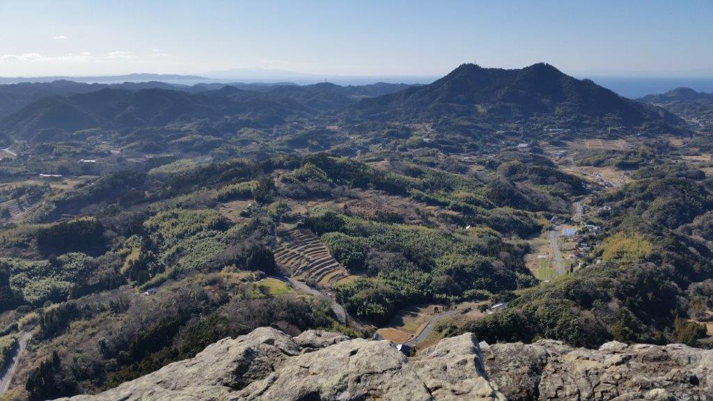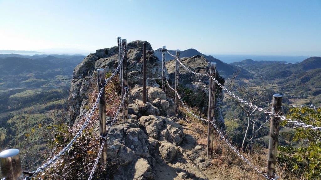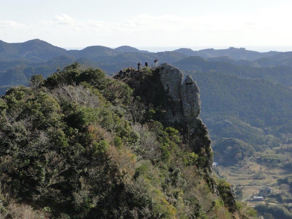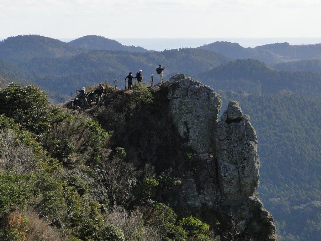 Mt Iyo is a rare rocky summit on the Boso peninsula and is the only one with the character “岳” (“take” meaning “high mountain”) in its name. The hike is a 2-hour loop from the Tenjingo (天神郷) bus stop and parking area near Heguri Ten Shrine (平群天神社), including a short round-trip between the north and south peaks. The narrow south peak (南峰) has a spectacular 360° view that includes Mt Atago, Mt Karasuba, Mt Goten, Mt Tomi, Mt Nokogiri, Oshima Island, as well as Mt Fuji; from the north peak (北峰) one can appreciate the precipitous south summit protruding from the mountainside.