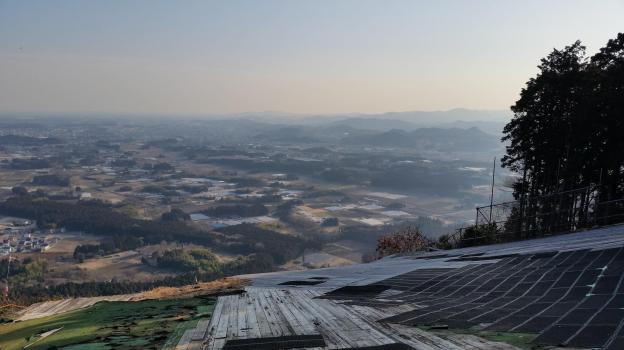 I reached the final peak of the ridge, Mt Akaiwa (553m), just before 4pm. After that the path started to descend quickly. On the way I passed the launching point for the paragliders that I had seen in the morning. Going down I took a wrong turn at one point and had to retrace my steps. However I got some nice views from that mistake. After I got back to level ground, I continued walking along a road through fields till I reached an onsen and a bus stop just before sunset.