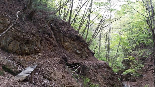 The first part was up along a stream following a steep valley. No sooner had I set out that a yellow-furred Japanese weasel or “itachi” crossed my path, the first time I had ever seen one. After crossing the stream several times on wooden bridges, the path suddenly gotten steeper. I was surrounded by the light green leaves of spring and it was very beautiful. Finally I reached the top of the ridge, and the going got easier.