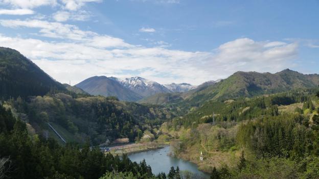 The weather was improving gradually, and after lunch, I got some better views of Mt Tanigawa and the neighbouring peaks. Unfortunately I couldn’t linger since there was still a long way to go. I started down, continuing North along the ridge. I had some nice views of Mt Hotaka, and finally saw lots of green spring leaves. After descending a long wooden staircase, I reached the bottom of the valley, and turned onto a nice forest road along a river.
