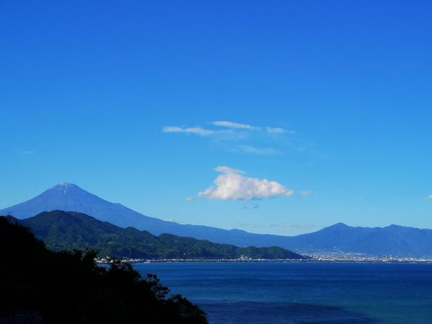 The trail had suffered a bit from the recent rains but climbed steadily through the forest. Eventually I emerged into an open area with great views of Suruga Bay, Izu peninsula, and Mt Fuji, slowly emerging from the clouds. After a short break, I set off again. Instead of climbing the path started to follow the contour of the mountainside – the surrounding vegetation reminded me very much of hiking on the Izu peninsula opposite, also part of Shizuoka prefecture.