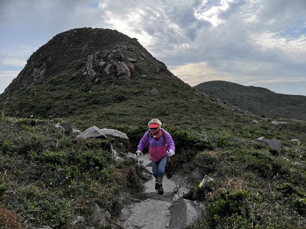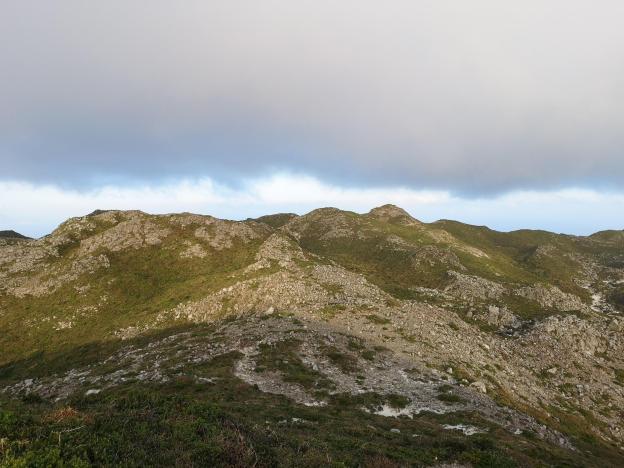 Once we had bundled up, we took in the surrounding landscape. We seemed to arrive at a sort of plateau covered with a mix of low bushes and grass, punctuated with a number of low rounded summits. Without a map, it would have been hard to know which way to go. The hotel owner of La Familia, had kindly drawn a loop trail on a map, and we followed it religiously. There were a lot more clouds today and thus less sunshine, but fortunately no rain.