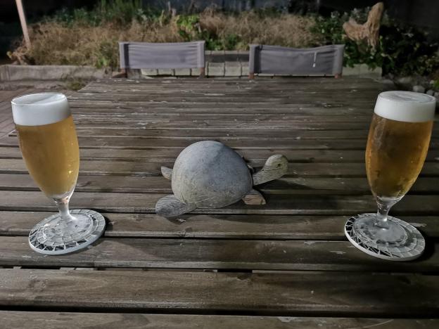 Two beers (and a turtle) for two tired hikers