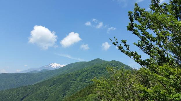 A great hike that follows two prefectural borders, first between Shizuoka and Kanagawa, then between Shizuoka and Yamanashi, Mt Mikuni 三国山 (“Three Country mountain”) being at the convergence of all three. A seasonal hiking bus running from Suruga-Oyama station took me up to Myojin pass (900m), from where I first hiked East along the ridge in to the top of Mt Yubune 湯舟山 (1041m). It was a cloudless and hot May day, but fortunately I was mostly under the shade of trees. I then retraced my steps to the pass, and continued Westwards to Mt Mikuni. After a bit of road walking and a short steep climb, I reached the peaceful flat summit, surrounded by cool green forest. After that, it was a nice ramble along a descending ridge with occasional views of Mt Fuji, mostly covered in cloud except for its snow-covered summit. I passed the minor peaks of Mt Naraki 楢木山 (1353m), Mt Obora 大洞山 (1383m) and Mt Hatao 畑尾山 (1365m). I finally reached a section I had hiked a few years ago in December, but had to abort because of a freak snowstorm. There seemed to be a serious war game taking place opposite on the lower flanks of Mt Fuji: I could hear explosions the entire afternoon (the foothills of Mt Fuji is a training place for the self-defence forces). I ended up at a very nice hot spring near the bus stop for Gotemba station.