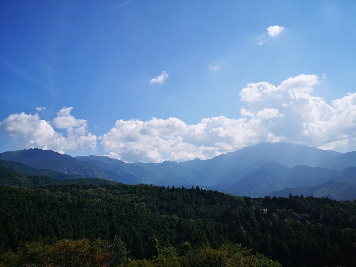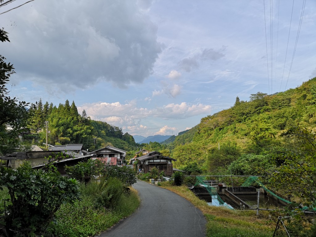 Just past the restaurant was the old bulletin board where travelers could leave messages for one another, a kind of ancient social media system. A little further was a lookout point, where I could gaze at Mt Ena (2191m), a hundred-famous mountain of Japan, climbed a few years ago. Next, I had to make a small detour around somebody’s garden to reach the official start of the hiking trail. After walking down some steps, I crossed the modern road connecting the two post towns, walked down some more steps, and then followed a dirt path next to a stream. I had to be careful not to step on the small green-coloured frog taking a break in the middle of the trail. I crossed the road again, and bought some water from a shop on the left side; the early October weather was turning out to be warmer than expected. I continued along a paved road slowly rising through a sleepy village. I spotted another frog, brown this time, squatting on the trail.