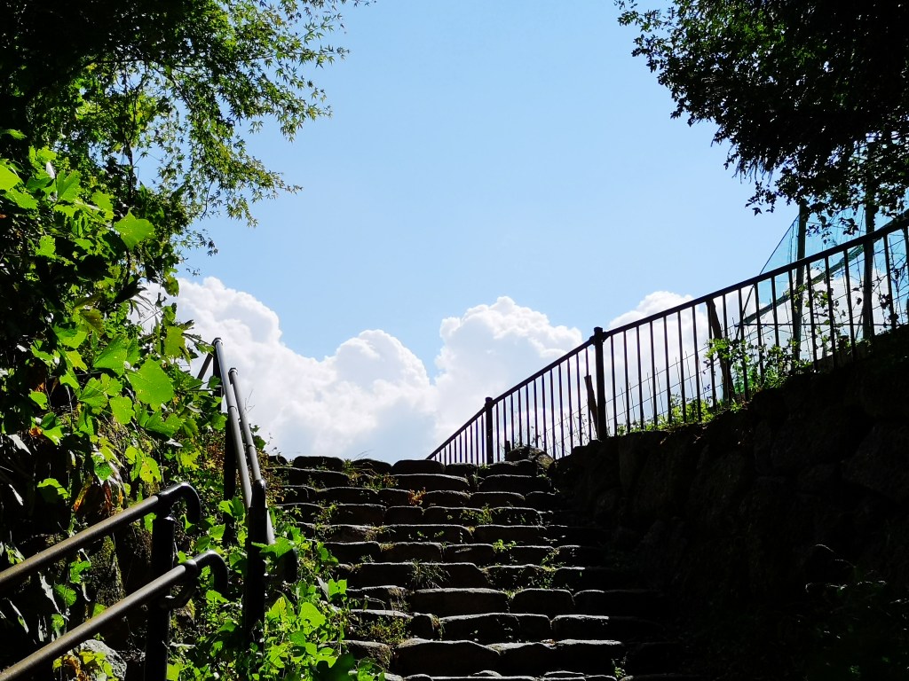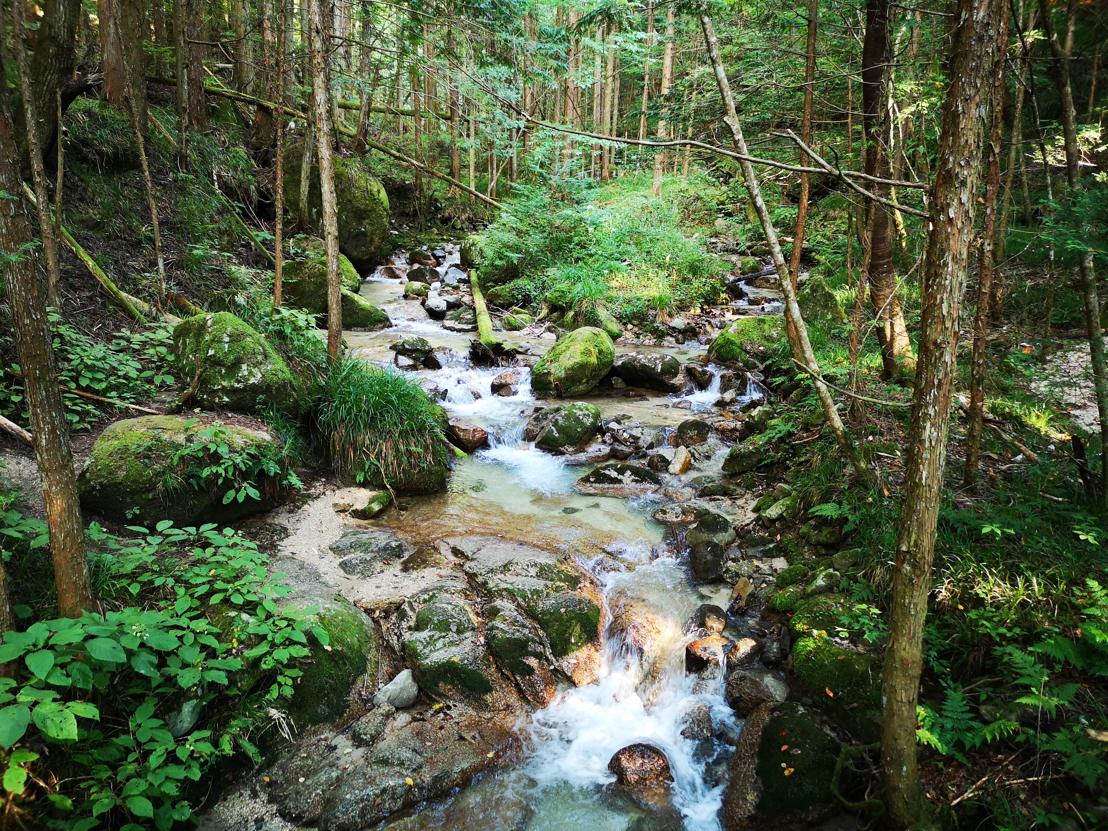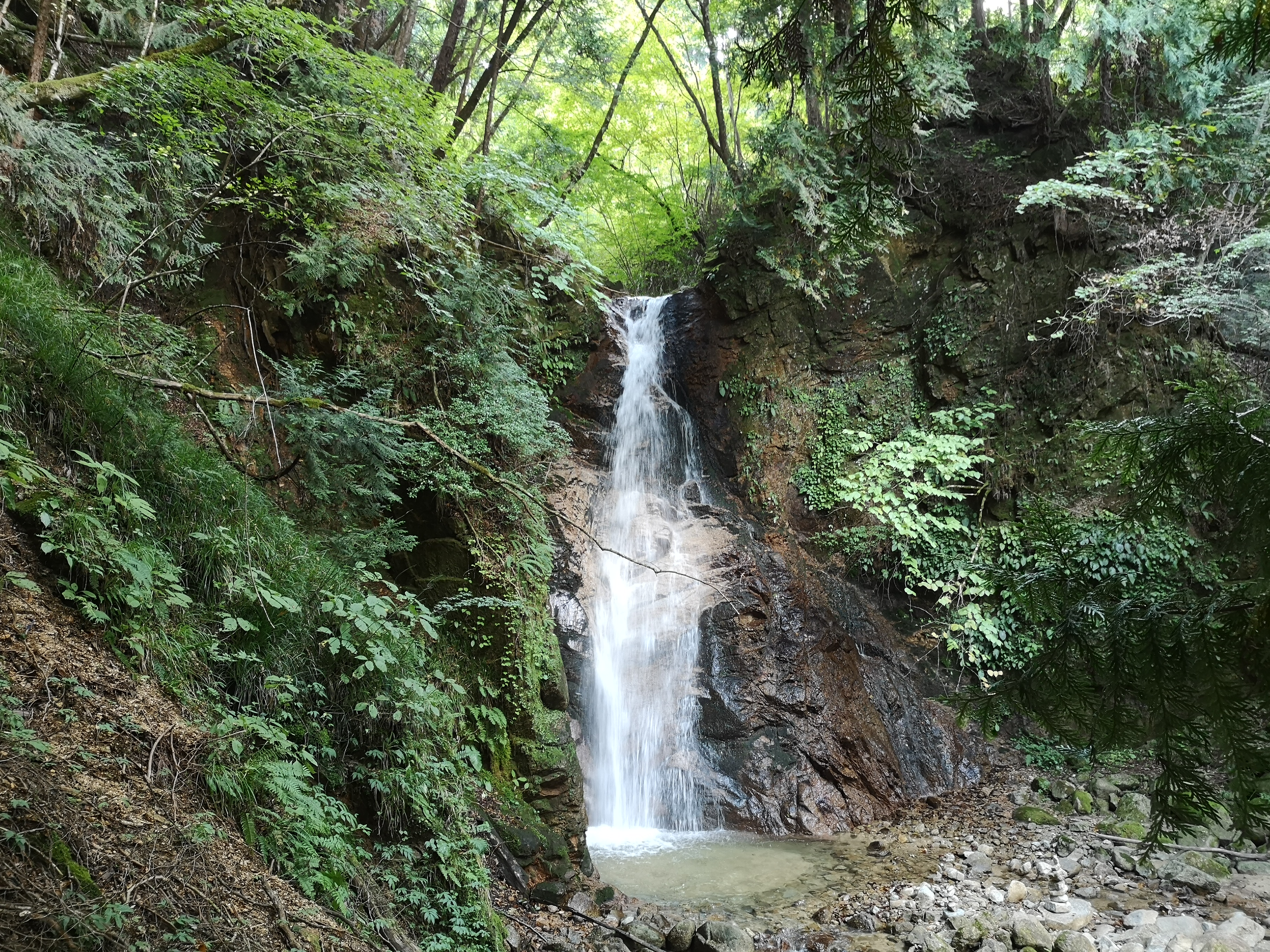 At 2pm, I finally reached Magome Pass, the highest point of the hike at 801 meters; I would now leave Gifu prefecture and enter Nagano. Straight ahead, I could see the summit of Mt Nagiso (1679m), popping out from above the treetops, and which I hope to climb one day. I thought that this was the nicest part of the hike: it followed an easy-to-walk path heading down the valley through a conifer forest. I could easily imagine myself in the Edo period, since there were few other hikers to remind me of modern times. Halfway down, I reached a spacious rest house; I was beckoned inside by the owner, made to sit at a long wooden table, and offered some cold green tea and slices of Japanese peach (“nashi”). Once again, an excellent example of Japanese hospitality. After setting off again, I crossed a bridge over a mountain stream, and a little later on, made a small detour to see a couple of waterfalls, simply called Male and Female waterfalls (男滝・女滝 odaki-medaki).