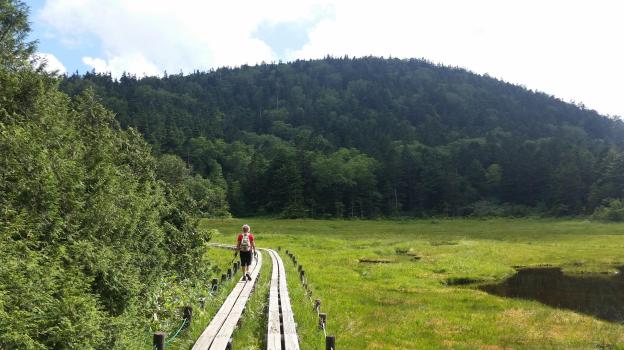 We drove on to Yokoteyama Ropeway which took us to the top of Mt Yokote 横手山. We got some nice views of Shiga Highland 志賀高原. Fortunately, the Nagano side was still free of clouds. We finally arrived at Kumanoyu (meaning the bear’s bath) where we left the car. We were now firmly inside Nagano prefecture. Another short ropeway took up to the start of the hike. Luckily, the weather was holding up. The first part was quite level. At one point the path went through some very high bamboo, higher than our heads, and I was worried about bears. So I reached into my bag to retrieve my bear bell only to realise that I had left it in the car!