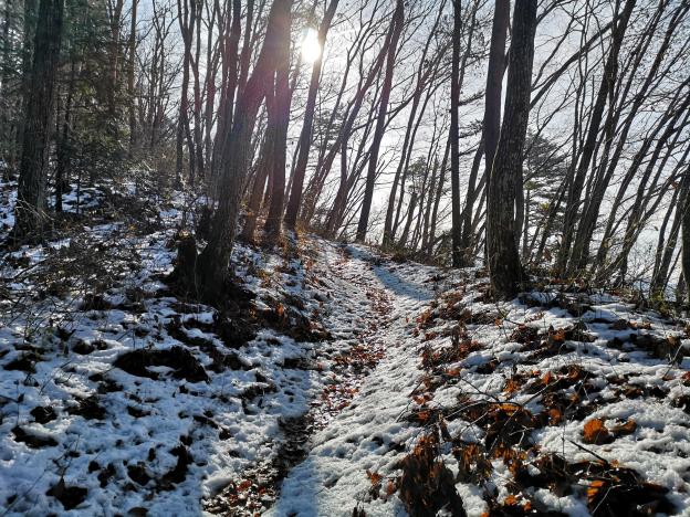 The path turned along the side of the mountain, and once it faced southwards, the snow did indeed disappear. It reappeared here and there further on, but it was never an issue. I was soon walking on the summit ridge, and after a couple of ups and downs, I reached the top of Mt Nodake 能岳 before 11am. The view of the Katsura river valley below with Mt Fuji in the background was outstanding.