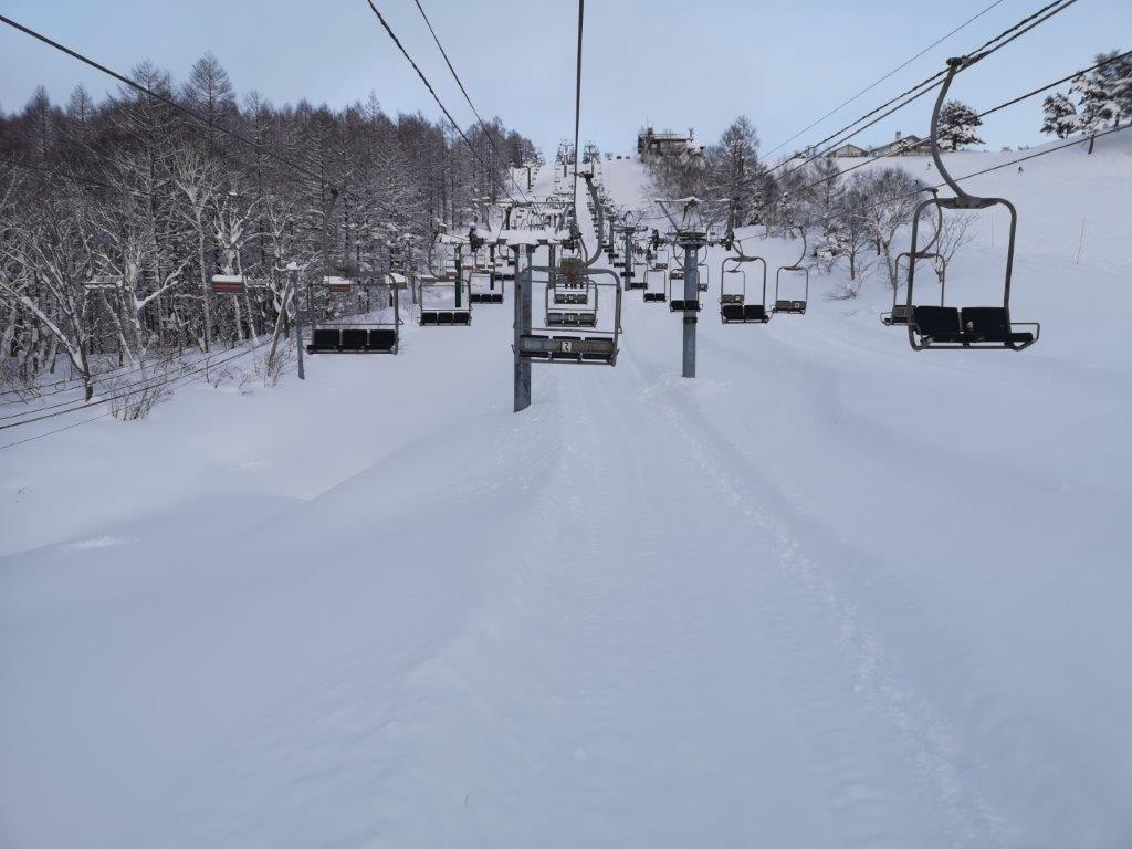 At 1h30, the sun suddenly came out and blue skies appeared overhead. I enjoyed nearly an hour of sunny skiing before the clouds charged back. Even though there were only four chairlifts (Madarao Kogen had 9), only one of them had a bar for resting the skis on. This is a curious thing about Japanese ski chairlifts: they almost never have that bar, so your legs are dangling in the air for the whole ride, which I find uncomfortable and dangerous. At 2h30, I made my way back to Madarao Kogen to have lunch. To avoid skiing a black in whiteout conditions, I used a blue to ski to the base of the resort. Oddly enough, it ended at the parking, and I had to skate a hundred meters over flat terrain to reach the lifts.