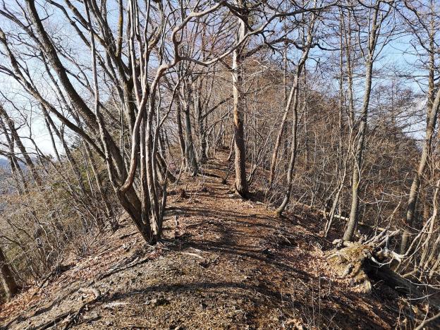 The forest road started to climb, and soon I reached a pass. To the right, was the start of a proper hiking path that headed South along a ridge. There were good views of the valley I had just walked up. To the right, I could also make out the summit of Mt Inafukumi, climbed just one year ago. The path went up and down along several minor peaks, and as I slowly gained elevation, I started to feel the freezing cold of January. After one last uphill scramble, I finally emerged onto the summit of Mt Ozawa 小沢岳 just after 2pm.