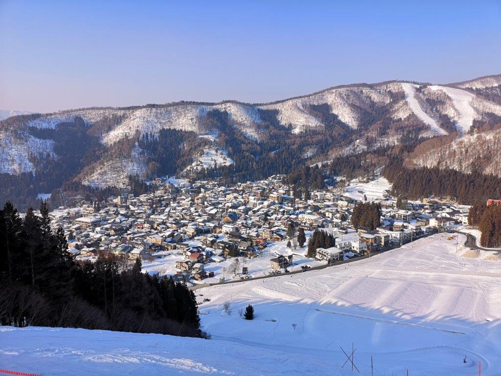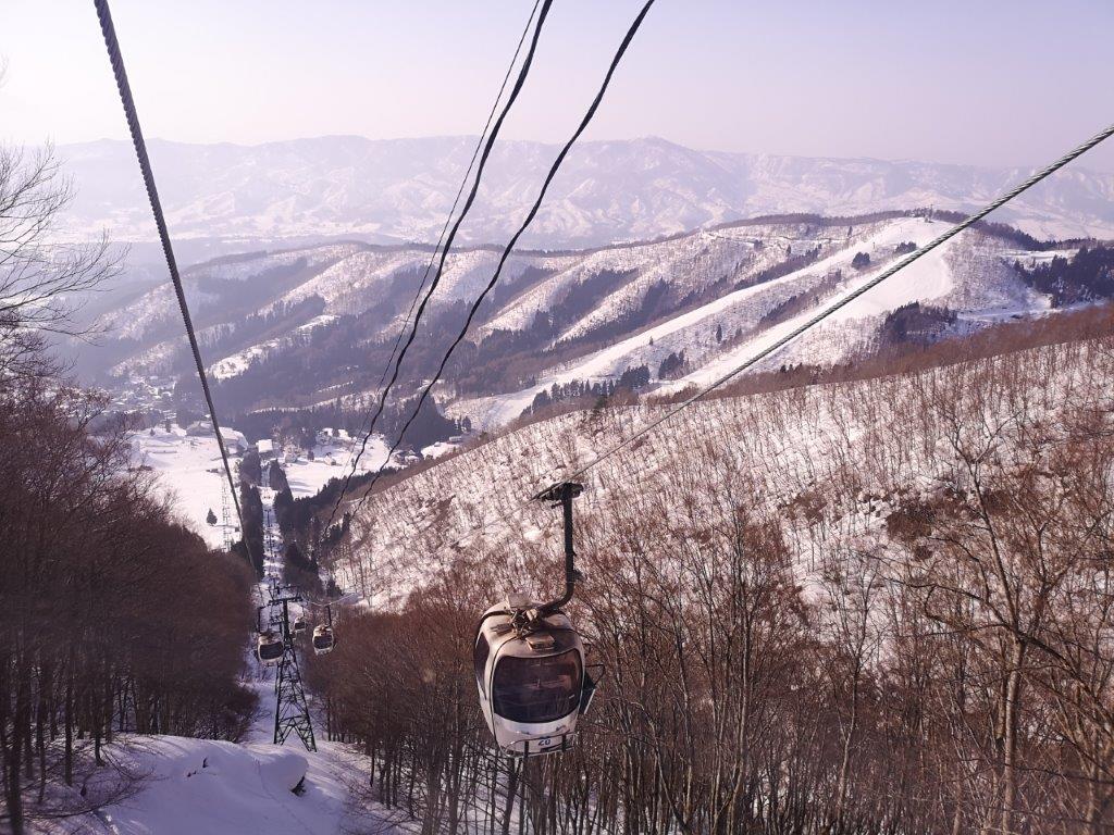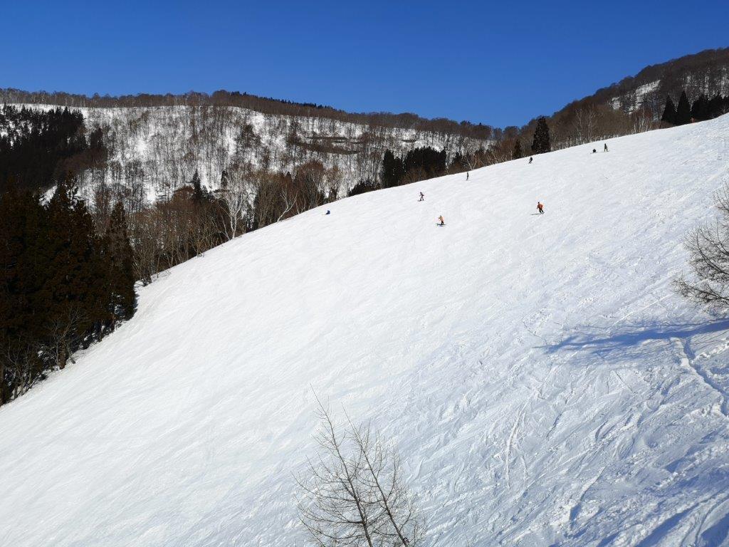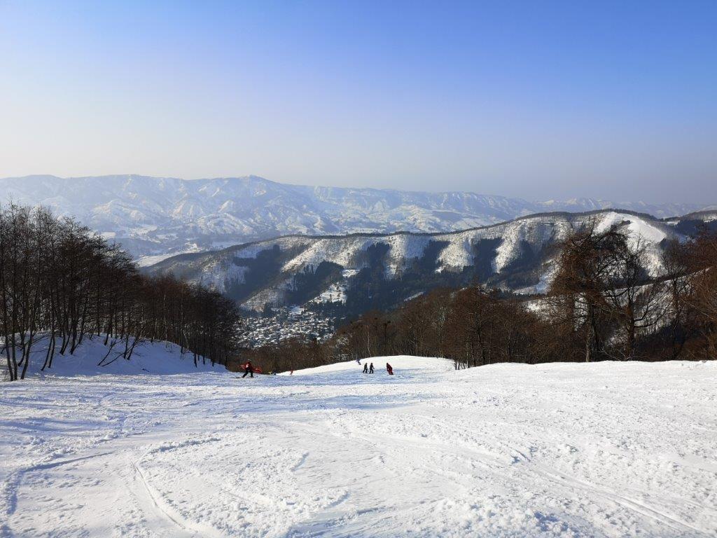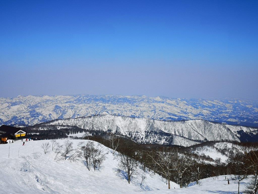 This was the only resort I knew well since I had skied there several times during my first years in Japan. Back then, the shinkansen ended at Nagano station, and I used to go there via overnight bus from Tokyo. Nowadays, Nozawa Onsen is just a short bus ride from Iiyama station on the Hokuriku shinkansen, and is included in the Welcome Japan JR East pass. I was curious to see how the resort had changed since my last visit about ten years ago. I knew for sure that the easier access had made it more crowed. The weather forecast was sunny blue skies but with unseasonably warm temperatures – about 12 °C at the base and 7 °C near the top. I was worried that the conditions wouldn’t really be suitable for skiing. However, I couldn’t resist the chance to check out the views, and also ski the “skyline”, one of the best slopes I’ve ever done in Japan.