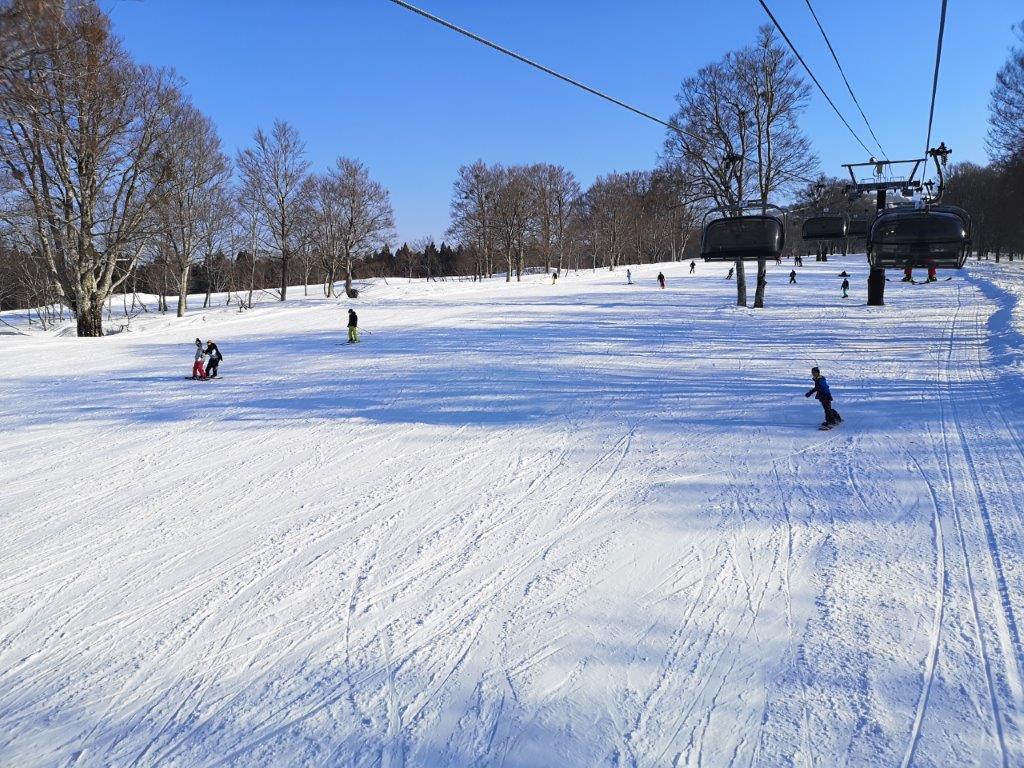 There was a huge line for my second chairlift of the day. Apparently, everybody else had had the same idea! Regretfully, I decided to flee the top area and head straight for the “skyline” before it got crowded as well. The “skyline” is a long slope following a narrow ridgeline from the top of the resort down to the village, alternating steep and flat sections. It has unobstructed views of the entire valley which is why it is such a spectacular and popular run. Luckily for me, it was now lunchtime, and I had several sections entirely to myself. After going back up with the gondola, I descended towards the Uenotaira area and did the “Challenge” slope, a nice red, a few times in the sun.