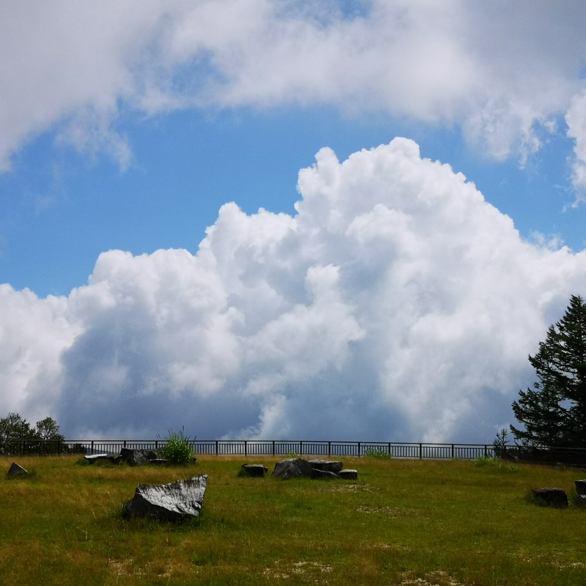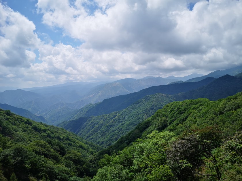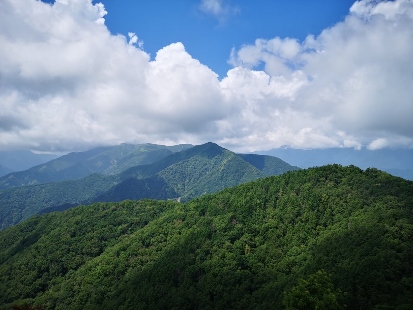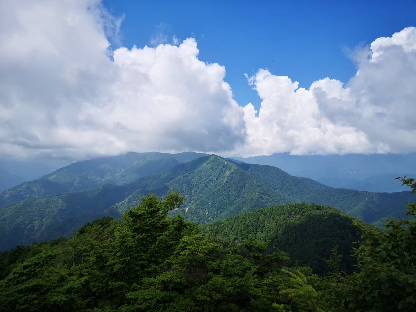 I got off the bus and admired the view for a while. The mountains ridges spread in every direction, with no signs of civilisation in the deep valleys. I finally set off at 11h30. The start of the trail was easy to walk, alternating level and climbing sections. I soon reached the observation platform below Mt Hangetsu, with a view of Chuzenji lake and Mt Nantai to the North. Since I had been there before, I moved on quickly. The trail continued via a series of tight switchbacks down a steep grassy slope with few trees and great views South and West; the sky was full of big puffy cumulus clouds, the biggest one sitting on top of Mt Nantai!
