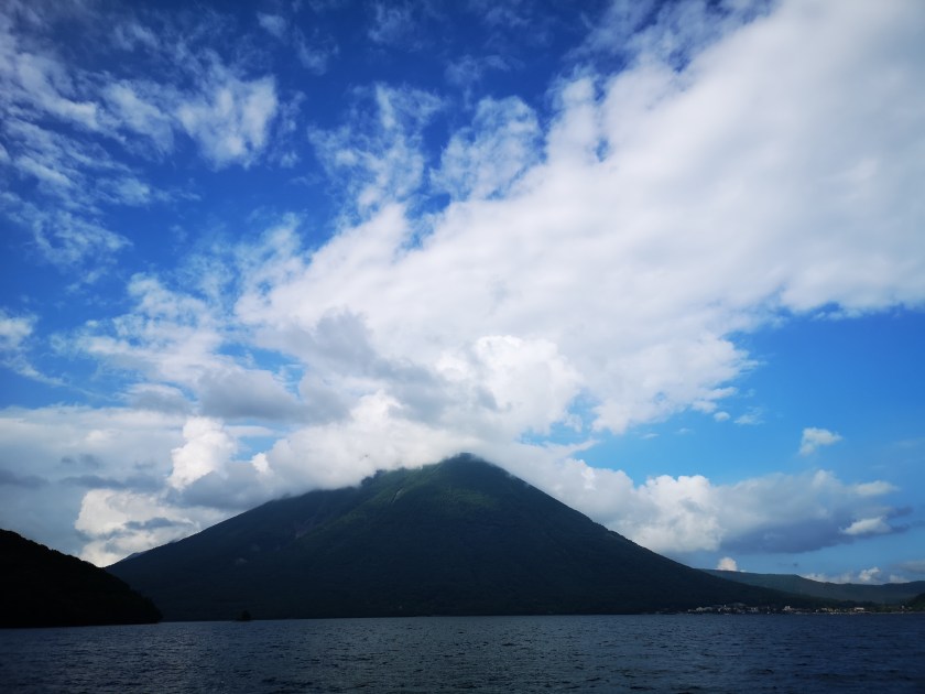 Mt Nantai, nearly clear of clouds, from the shore of Chuzenji Lake