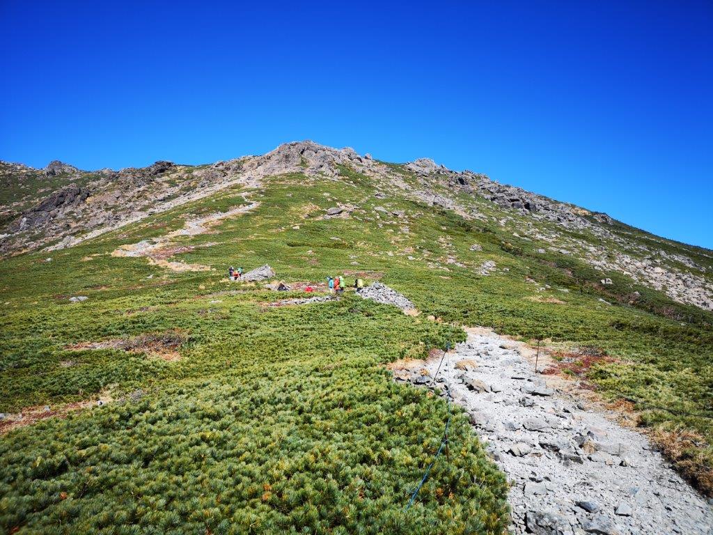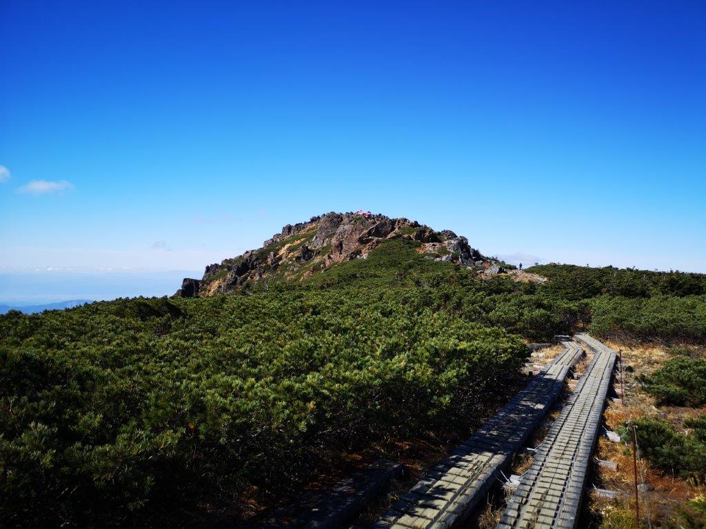 At 9h30, I stepped onto a wooden walkway leading into the forest in the heart of the Hayachine Quasi-National Park (早池峰国定公園). The path soon started to ascend; half an hour later, I emerged from the trees into an alpine landscape of rocks and ground-hugging creeping pine; turning around, I had a good view of Mt Yakushi (薬師岳), the other main peak of the quasi-national park. The path was easy to follow with good signposts, the sides roped off to prevent hikers from straying in case of a whiteout.