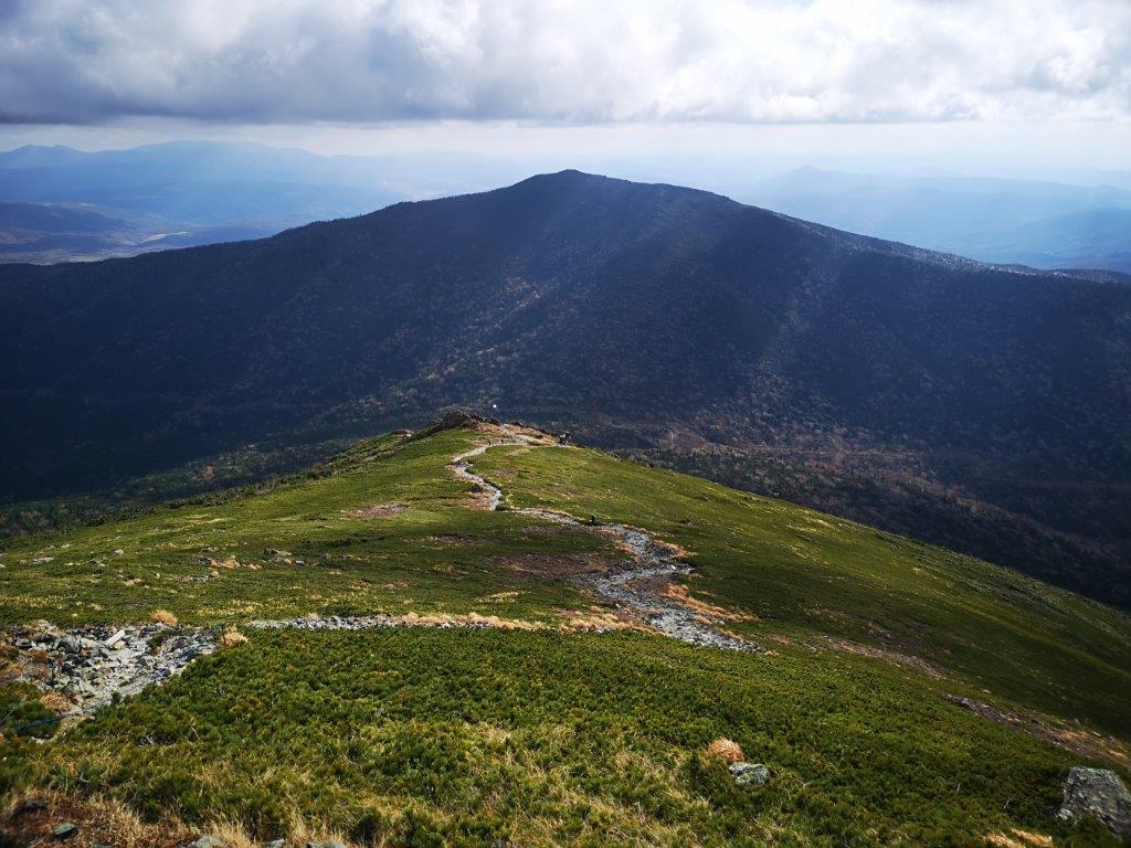 I had impressive views of the long valley running east to west, thanks to the perfect weather and absence of trees. I reached the rocky area just before 11am and made my way carefully up the long metal ladder. Shortly after, I reached the the flat summit ridge. I turned left, and ten minutes later, I was standing on the top of Mt Hayachine (早池峰山 はやちねさん hayachine-san), a 100 famous mountain of Japan. Since it’s the highest peak in the whole area, I had a bird’s eye view of the mountains of Iwate prefecture in all directions. To the northwest, 50km away, I could make out the triangular outline of Mt Iwate.