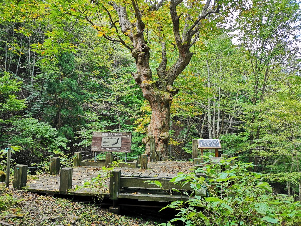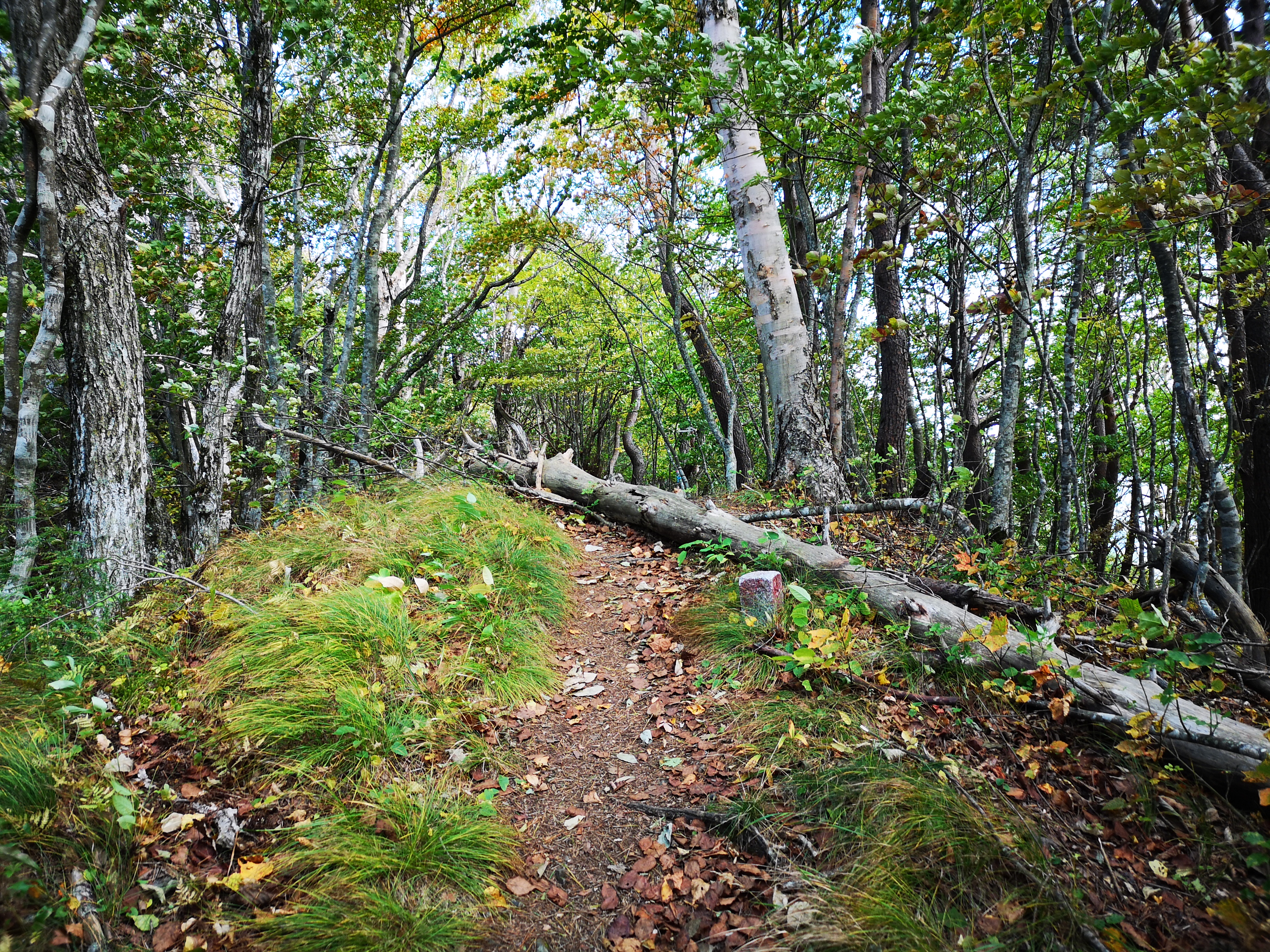 I arrived at Haguroshita station at the rather late hour of 11am. The sky was still overcast but I was feeling optimistic. The taxi driver told me that the current Emperor, an avid hiker, had once climbed this mountain. The last kilometer of the road, including the parking area, was closed due to road repair, and so I expected to see no one else on the mountain today. The first part of the hike followed a forest road parallel to a river. The surrounding forest was wild and undisturbed, and it felt wonderful to be hiking in Nagano prefecture. I was occasionally startled by sudden noises coming from the forest – falling chestnuts, not a bear stepping on a branch. A little after noon, I reached the official start of the hiking trail. Looking up, I could see wide patches of blue sky.