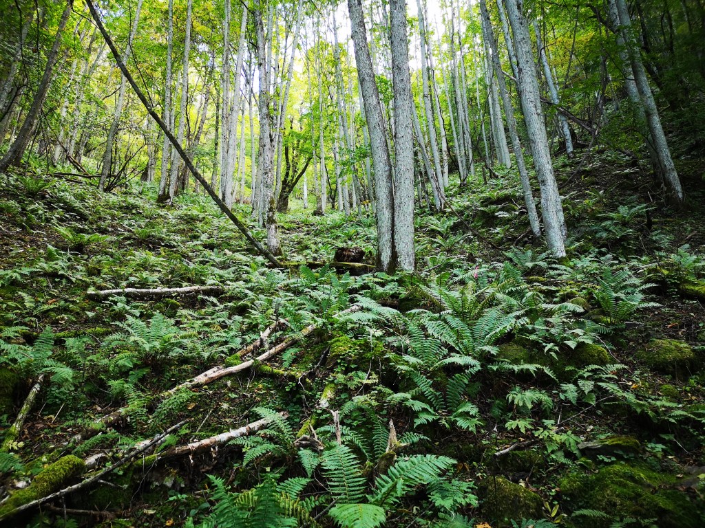 The trail climbed slowly through the dark and peaceful forest. It took me about half an hour to reach a giant Japanese Horse Chestnut tree (トチノキ tochinoki). It’s one of the hundred giant trees in Japan (I had last encountered one in Ibaraki earlier this year). After checking out this impressive giant tree, I continued on my way. For the first time while hiking, I spotted several daddy long-legs spiders (see video at the end). There were many fern plants on the ground, a nice change from bamboo grass. The path was getting steeper and steeper, and soon it became a series of switchbacks. I was quickly gaining altitude, and thirty minutes later I popped onto a ridge. I was greeted with a blast of cold wind, and I had to take a short break to add a layer of clothing.