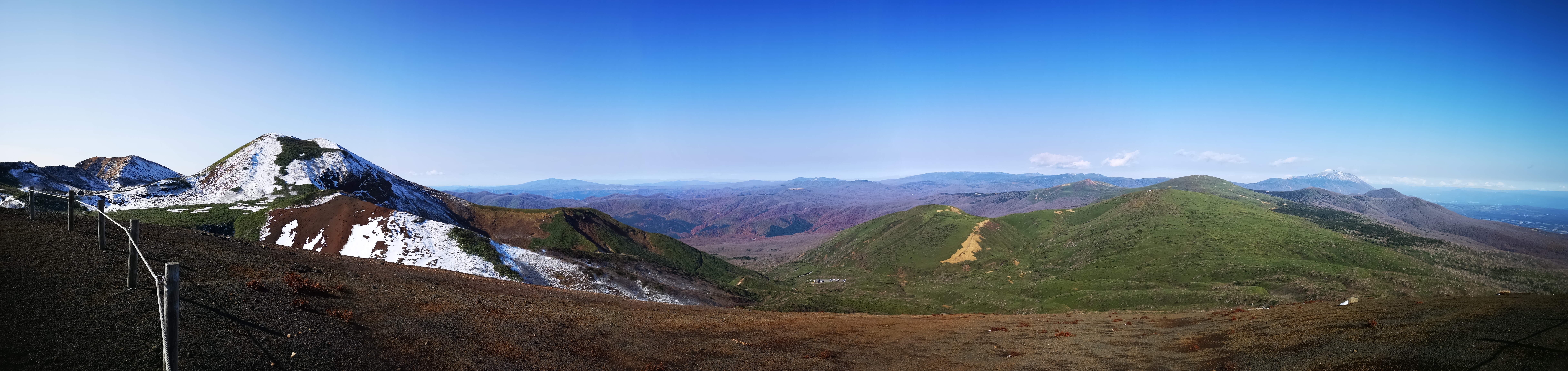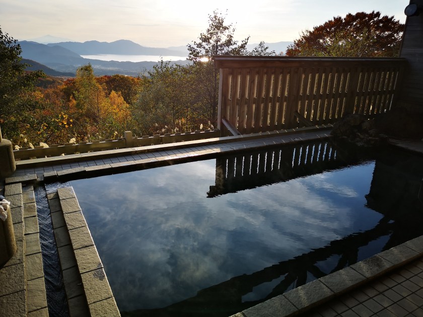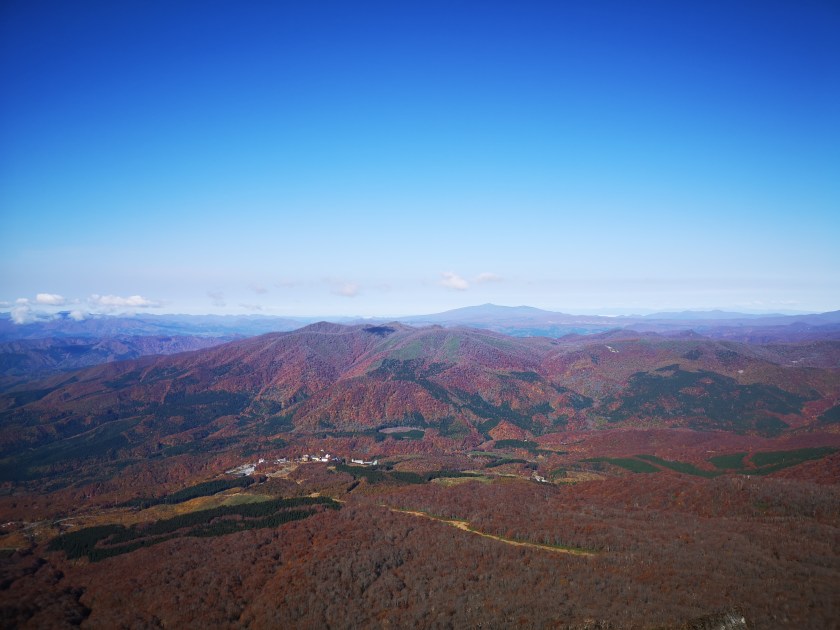 After a short up and down, I was standing on top of Mt Yumori (湯森山) at 2pm, the last of today’s peaks. After gazing at the mountains of Akita one last time, I set off on the final descent towards the parking lot at Hachigome. It followed a staircase in bad need of maintenance. At 2h30 I was finally back at my starting point. On the way back, I stopped by at the Arupa Komakusa hot spring which had perhaps one of the best views I’ve ever had from an outdoor bath.