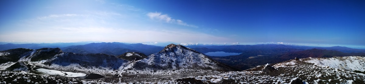 It took me 45 minutes to reach the first snow on the saddle between the two highest peaks. I made my way along a wooden walkway, next to a frozen lake, till I reached the Hachigome hut (八合目小屋). There, I turned left for the final climb, up a wooden staircase. Less than 30 minutes after reaching the saddle, I was at the top of Mt Oname (男女岳 the name combines the characters for man and women), the highest point of Mt Akita-Komagatake (秋田駒ヶ岳), the highest peak of Akita prefecture and a 200-famous mountain of Japan.