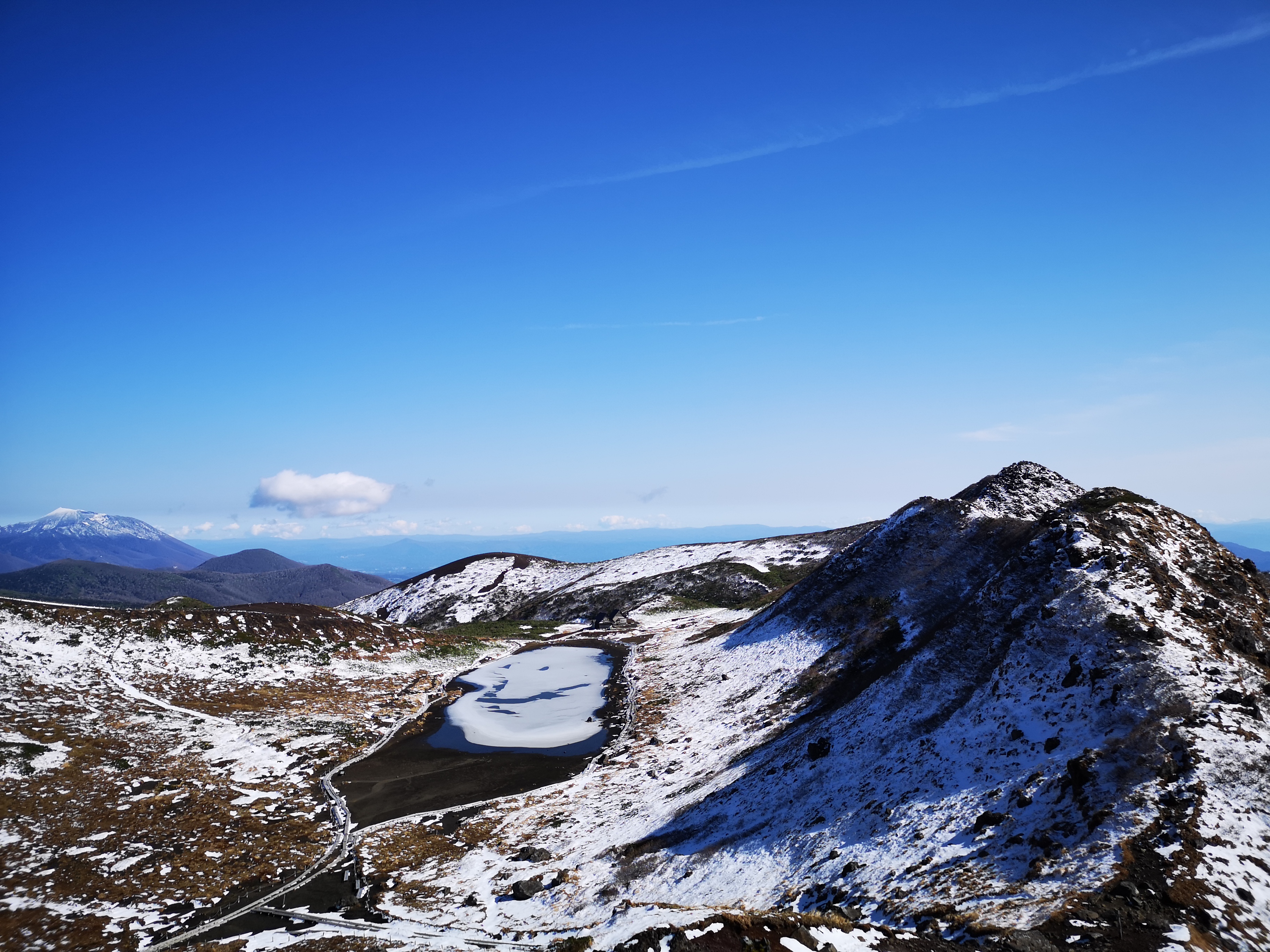 Since I had completed the first part of the hike on schedule, I decided to take the longer route, following the crater ridge counter-clockwise. This section was narrower and rockier, and few hikers had chosen to take this route. Fortunately, the thin layer of snow wasn’t an issue, and the views looking back to Mt Oname were spectacular. So far, this was a very enjoyable hike, even with the thin layer of snow.