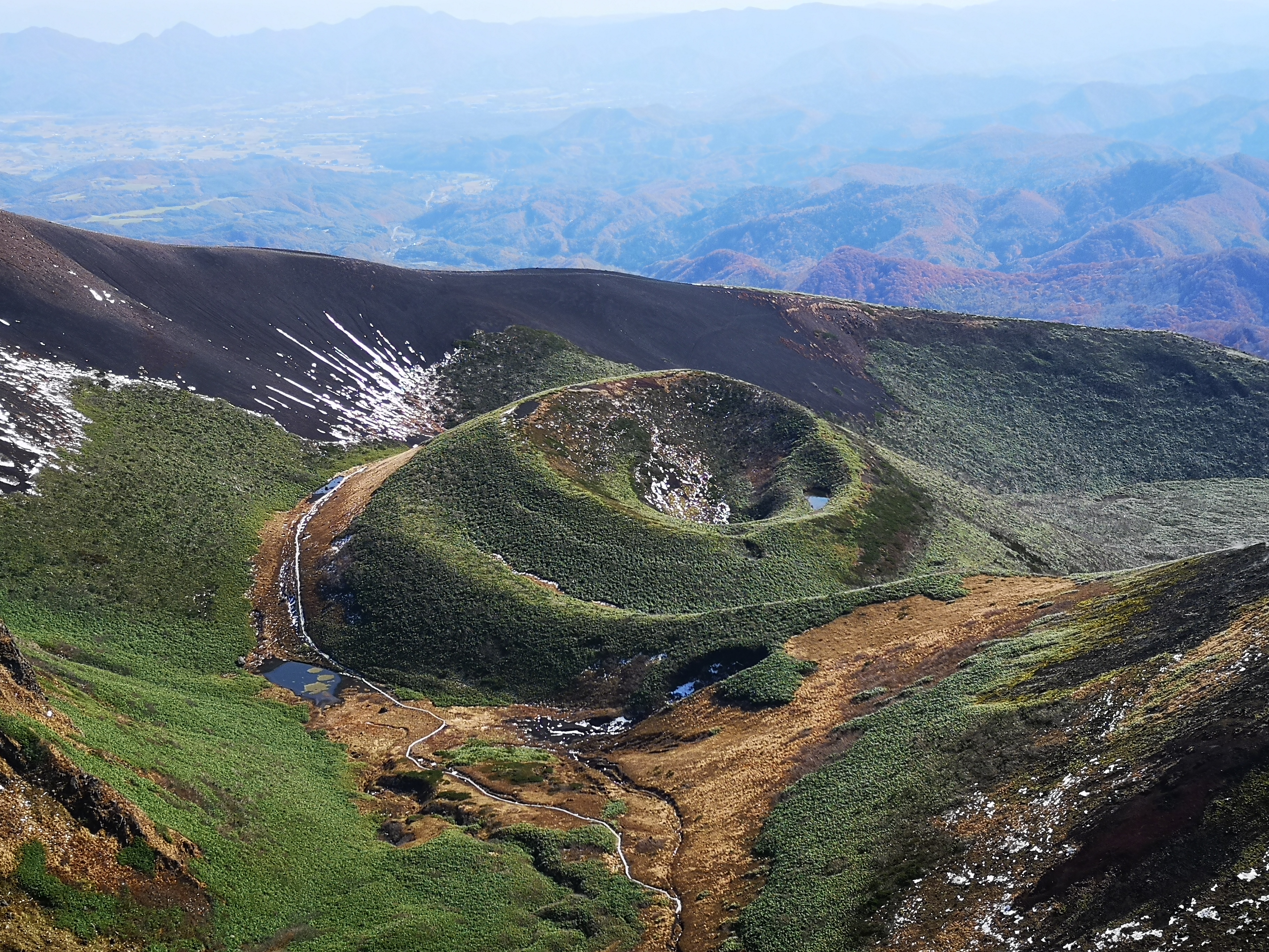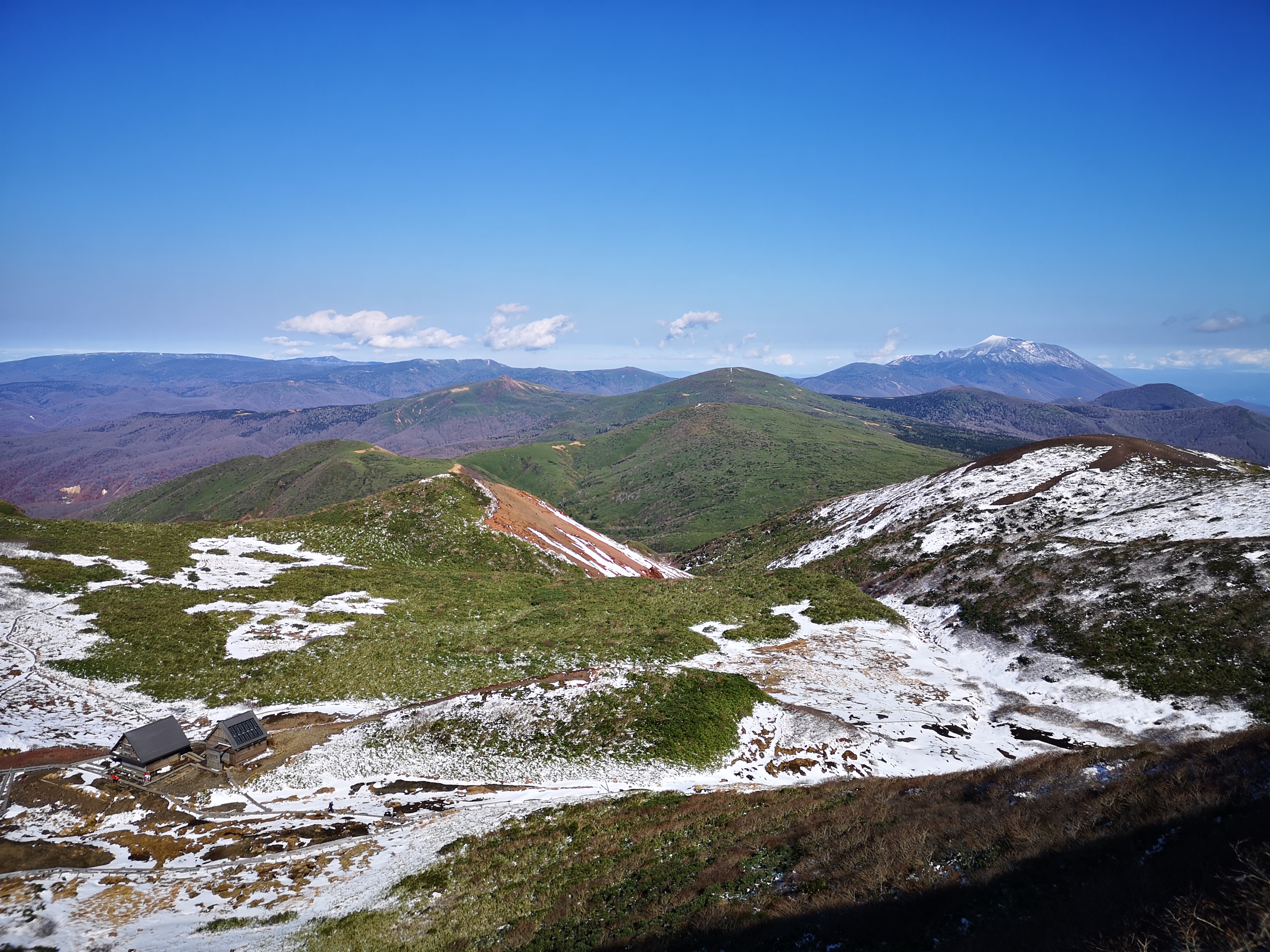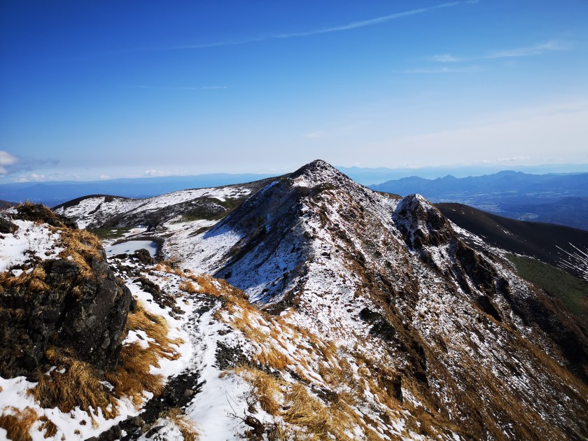 After passing several small peaks, I finally reached Mt Yoko (横岳) at 12h30, where I had a good view of the central plain of Iwate prefecture to the east. It was starting to get quite warm, and I felt that I had been wrong to worry about the snow. I had the rest of my lunch and set off in good spirits.