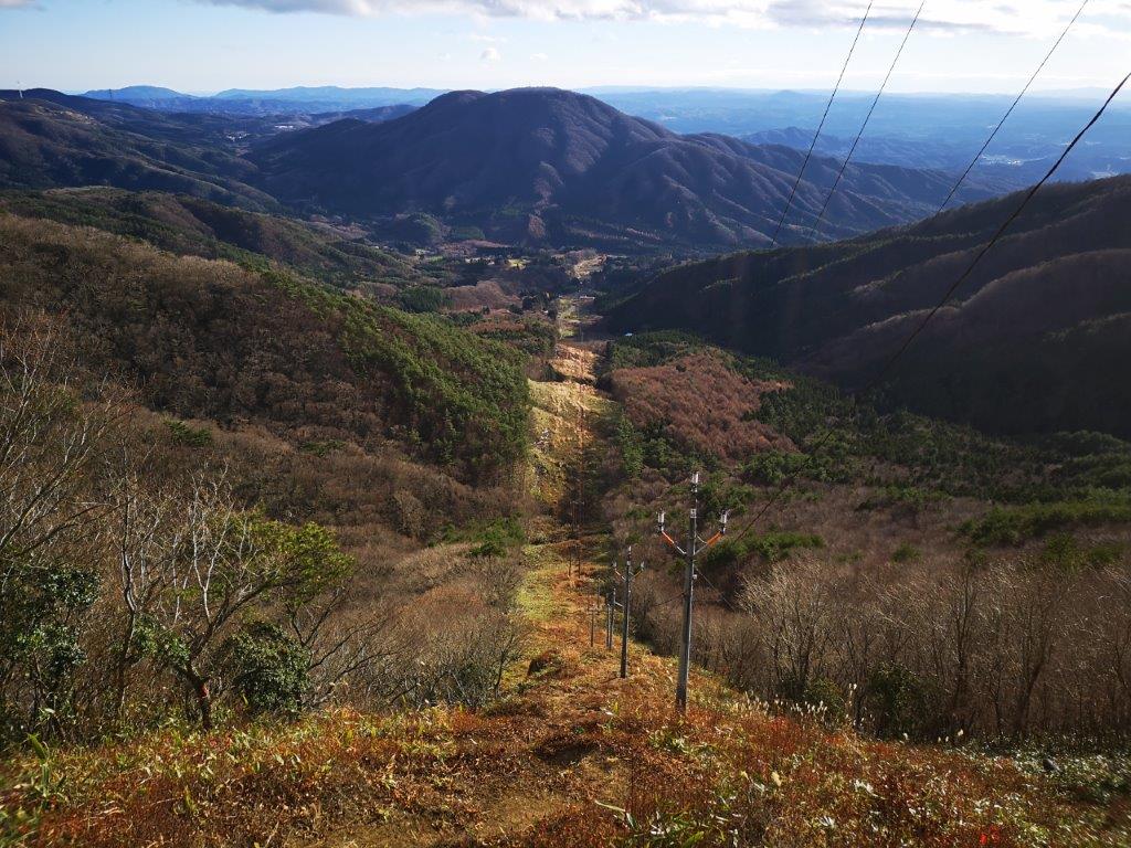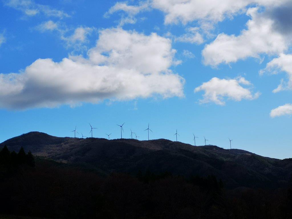 I checked my watch and saw that it was past 2h30. I had to get back to the station in less than two hours, including walking back to the station. The return path followed a clearing made for a power line and electric poles, heading straight down the mountain. It was steep and tough on the knees but the bird’s-eye view was worth it. Lower down, as the slope became less steep, I enjoyed walking among the “suzuki” (Japanese pampas grass), golden in the afternoon sun. It took me about 30 minutes to reach the road at the base of the mountain. From there it was another hour walk to the station. Looking back occasionally, I could see the round white self-defense base shining in the late afternoon sun, the grey “pokke” rocks poking through the winter forest, and the silver wind turbines spinning in the never-tiring wind.