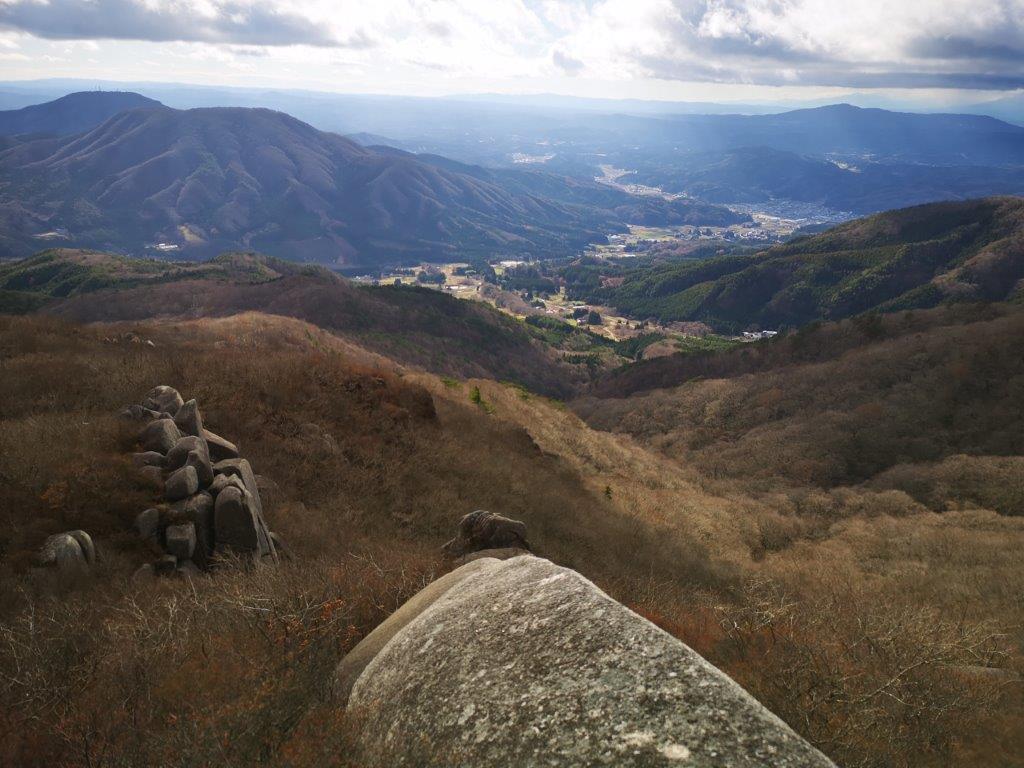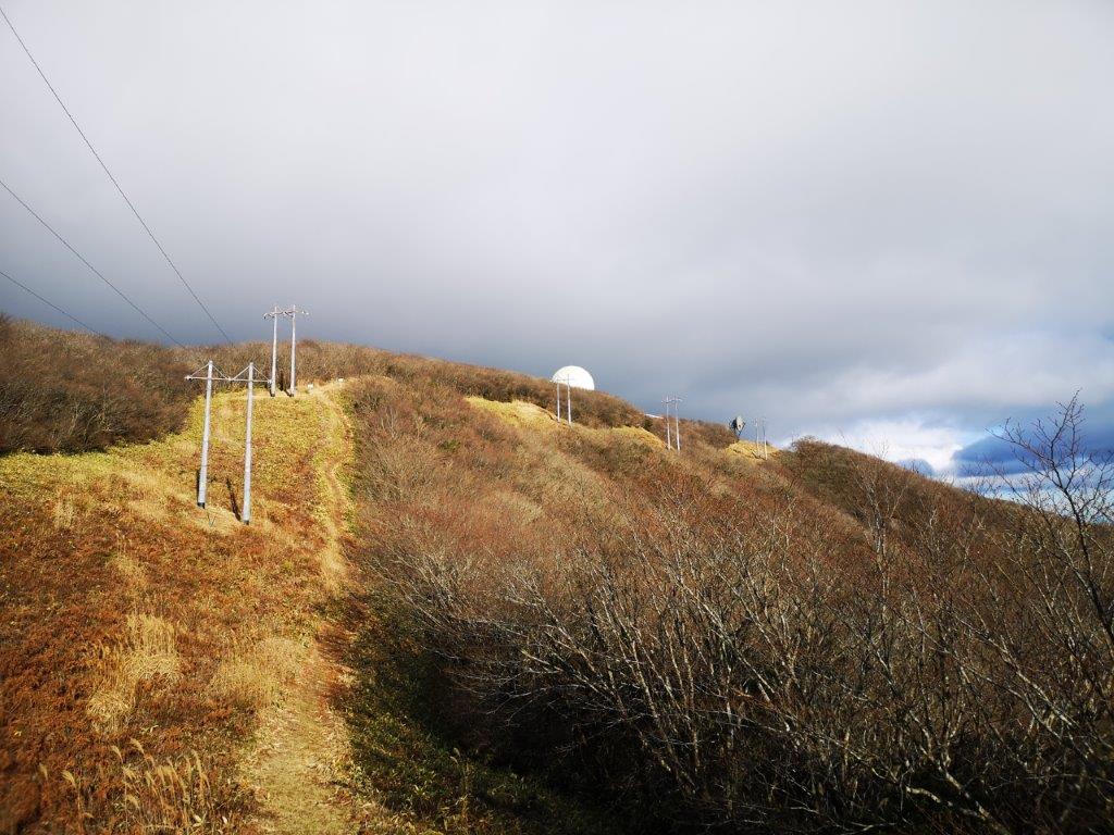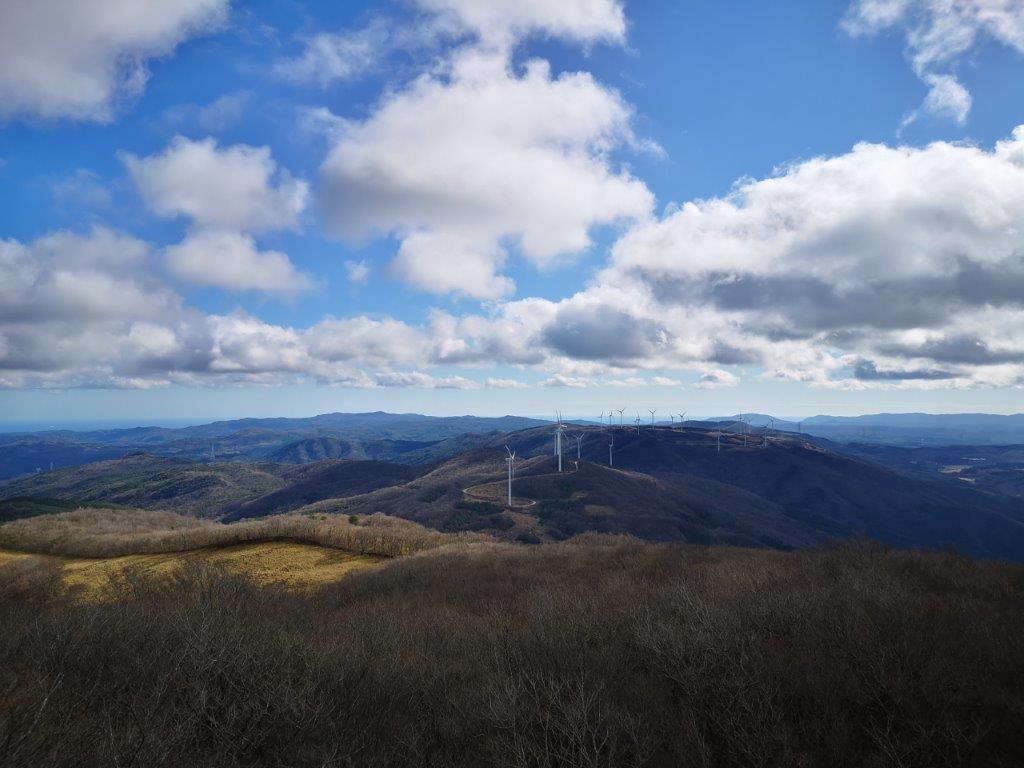 I managed to eat my sandwich before it got blown away, and left as soon as I was done, since the sun was now in the clouds and it was freezing cold. A little after 1pm, I reached the turn-off for “perapera-ishi“(ペラペラ石) which according to my guidebook was worth a look. It took me 15 minutes of mostly level walking to reach a collection of big rocks looking out on the Pacific coast. Dark grey clouds hovered above, and the view wasn’t as great as I had hoped. In the distance, I thought I could see a chimney of the Fukushima Daiichi nuclear power plant just 30 kilometers away, where disaster had struck about 10 years ago. Back then, some people in Tokyo were afraid of Fukushima, but now some people living in places such as Fukushima are afraid of people from Tokyo. I retraced my steps to the main trail, and continued to the nearby summit area.