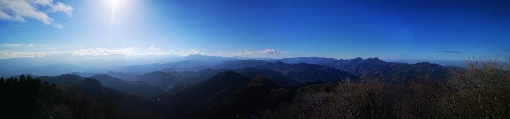 After hiking up a series of staircases, I reached the observation tower and the top of Mt Jomine (城峯山じょうみねさん jominesan) at 1pm. The Japanese name means “Castle Peak”, perhaps a reference to the rocky section further west along the top ridge. It seemed to double as a communication tower as there were several satellite dishes attached to it. Although the Saitama side was cloudy – no chance of seeing Mt Fuji – there was nothing but blue sky on the Gunma side. This is probably one of the best views in the area, and also one of the easiest to access.
