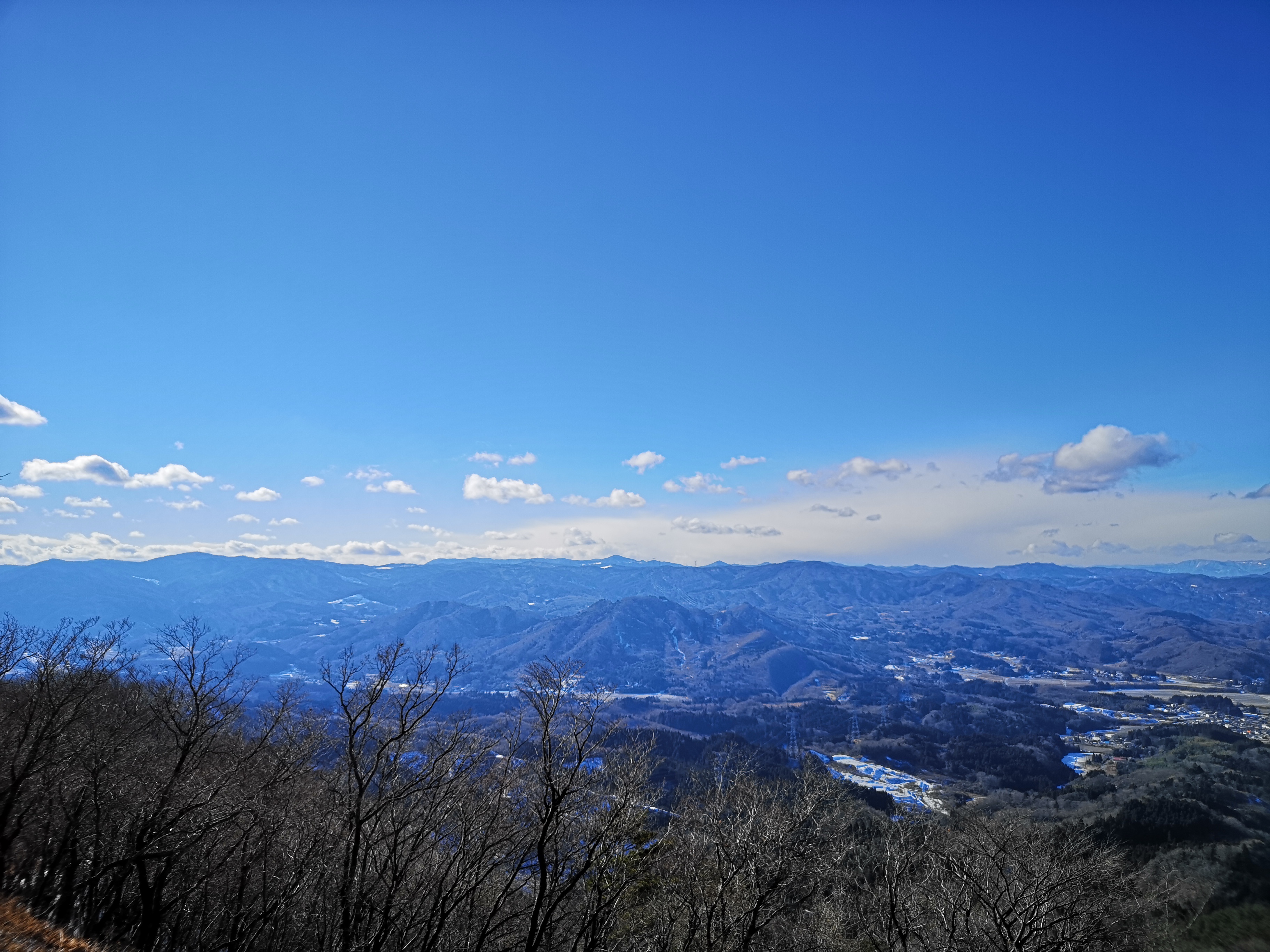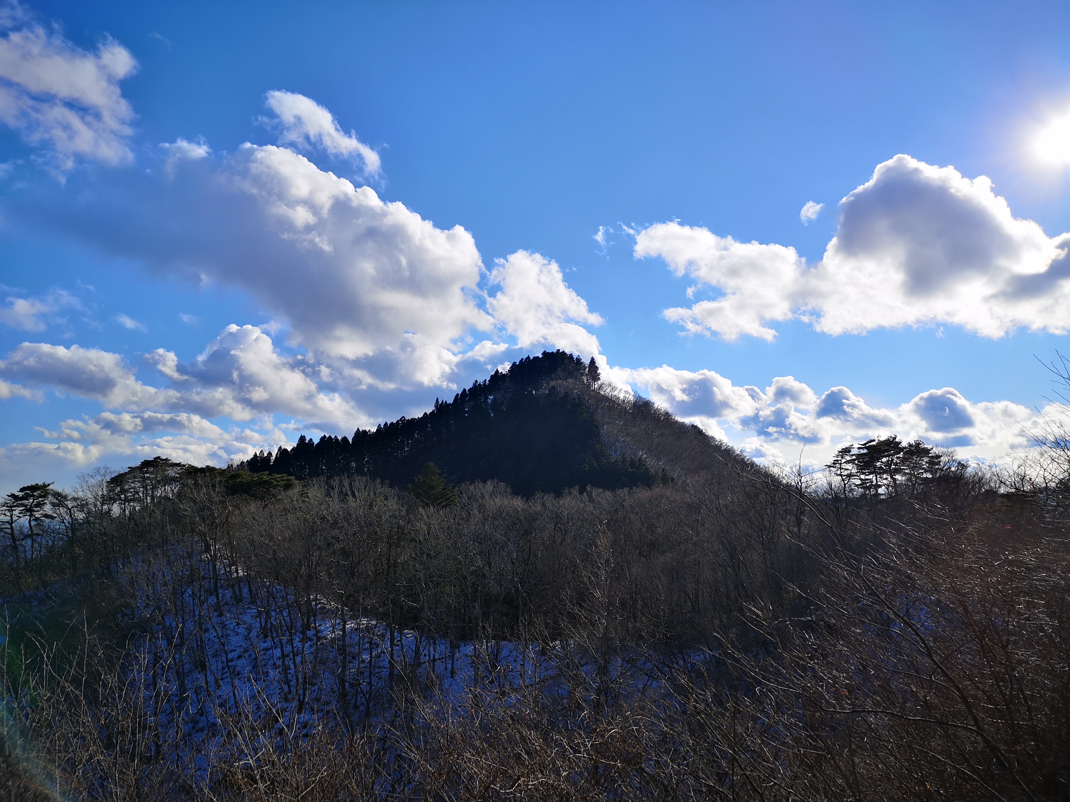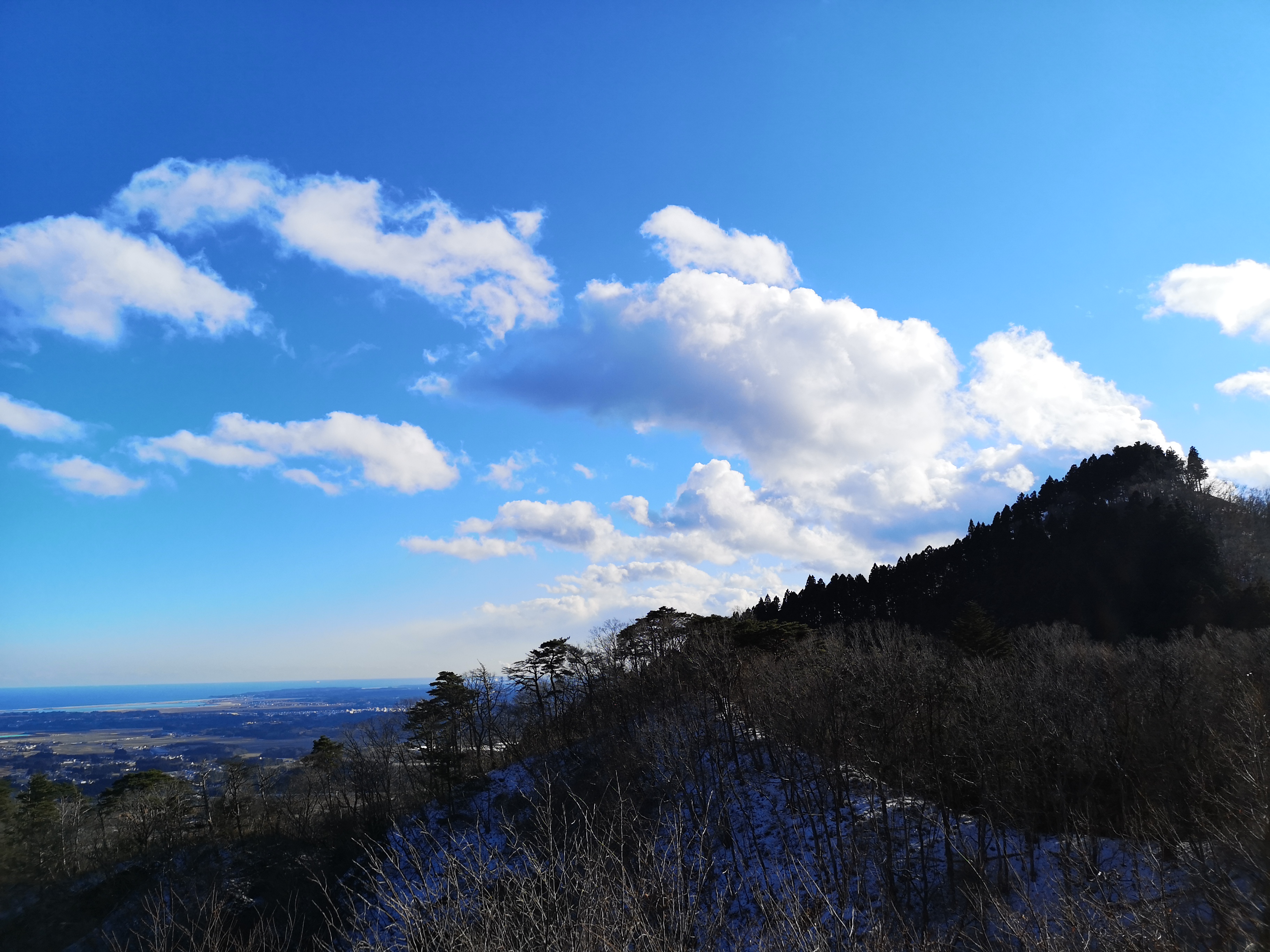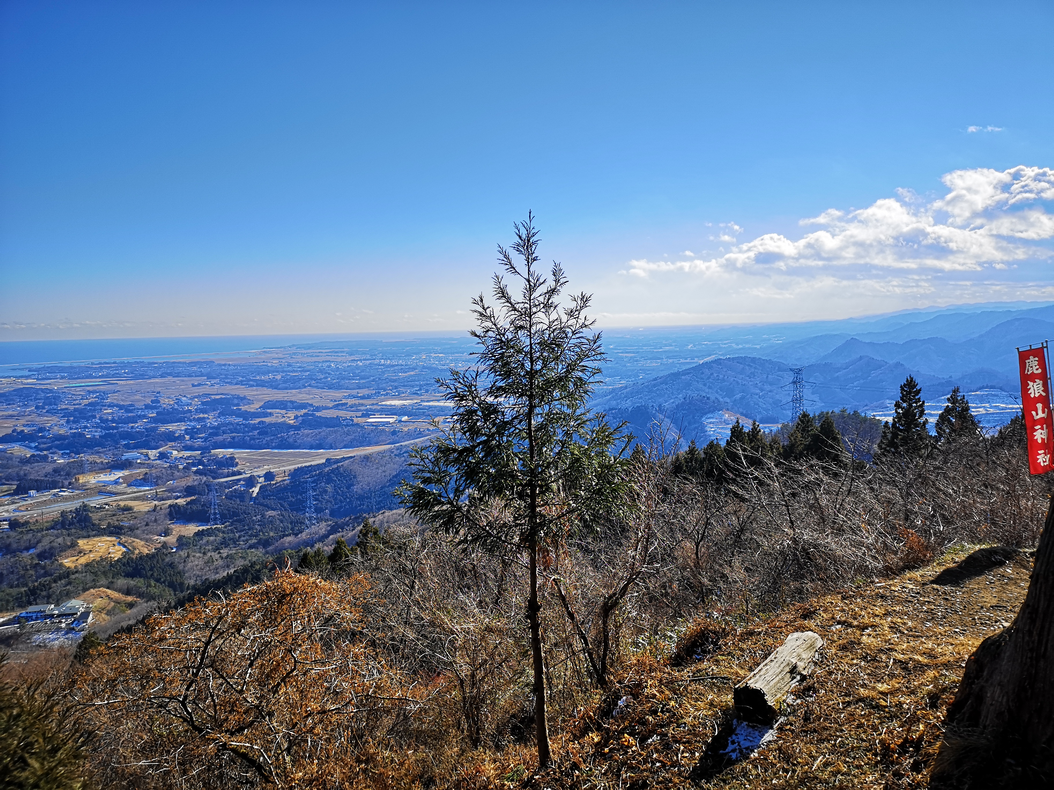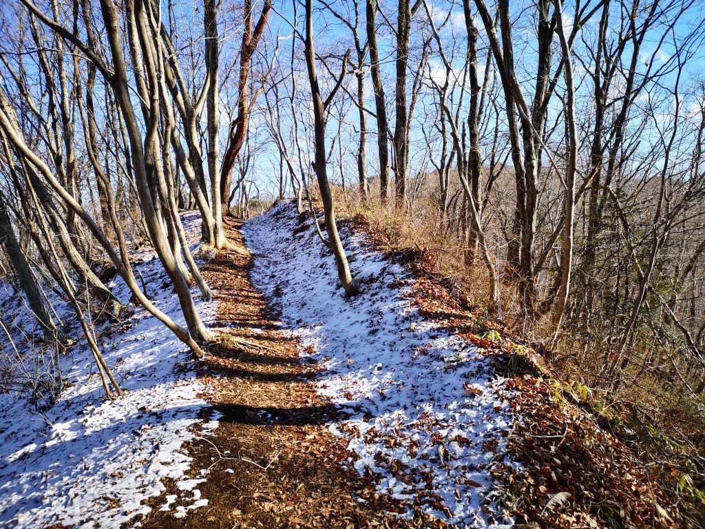For once, the shinkansen was delayed, and I lost one hour on the way to Sendai. To make up for this, I called a taxi from Shinchi station on the Joban line to take me to the start of the trail, 6 kilometers away, and I was ready to start hiking at 11h45. The weather was good but cold; there was even a thin layer of snow in places out of the sun’s reach. I chose to head up the “chobo” or view trail; it meant I would be walking with my back to the view, but I wanted to be in the sun to warm myself up. Even though it was a short climb, there were frequent signs along the way telling me how many meters were left to the summit.