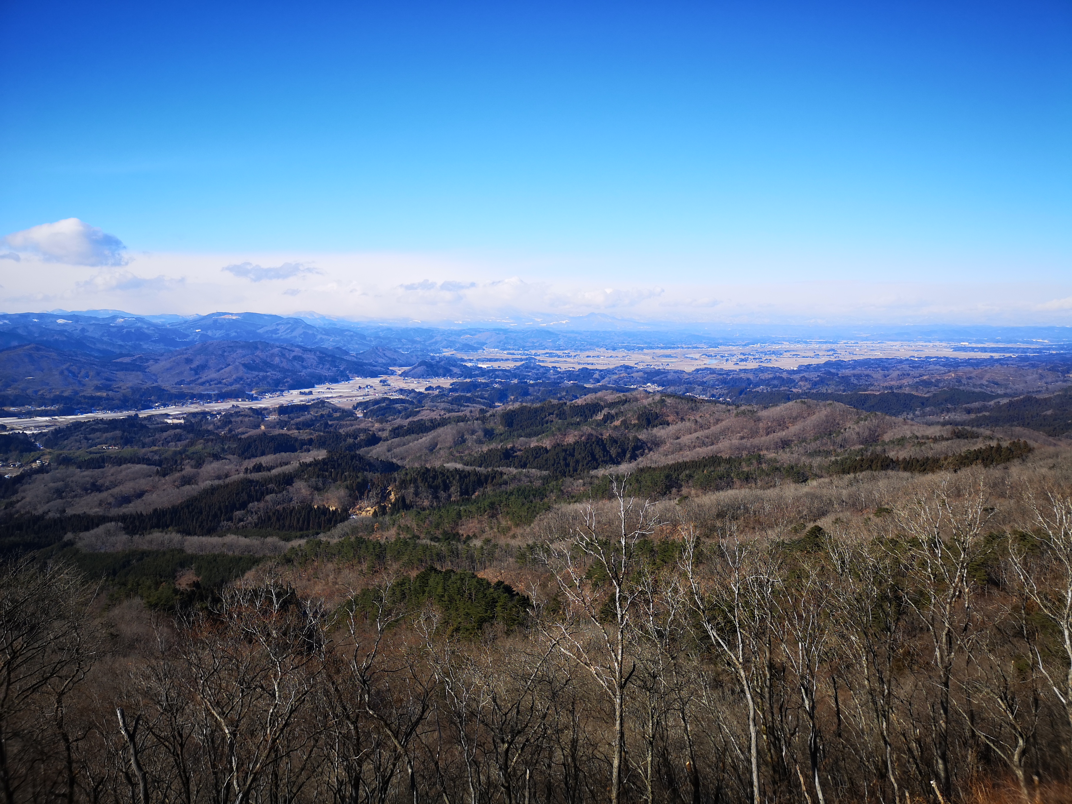 It took me half an hour to reach a small shrine inside a cluster of cedar trees. Right next to it, and bare of trees, was the summit of Mt Karo (鹿狼山 かろうさん karousan). Looking east, I took in the blue immensity of the Pacific ocean; squinting north, I could just make out the Oshika peninsula in Miyagi; gazing south, I could admire the rolling hills of the Abukuma highlands; turning west, I could see the mountains and valleys of Fukushima, but in the distance, Mt Zao was in the clouds. I decided to walk northwards to the end of the trail, and then retrace my steps for a second chance at the view.