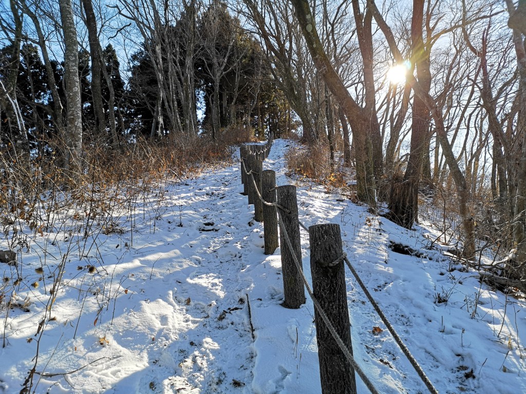 First I had to tackle a steep and slippery staircase covered in snow. The trail then followed the rolling ridgeline as it slowly descended to the coastal plain. The surrounding forest, bare of foliage, was beautiful as the sun shined through unimpeded. It took me 45 minutes to reach the end of the hiking trail at a road crossing. There, I turned around and walked the same way back. Although this trail is called the Zao view route, the only view of Mt Zao was from the summit, which I reached again at 2h30.