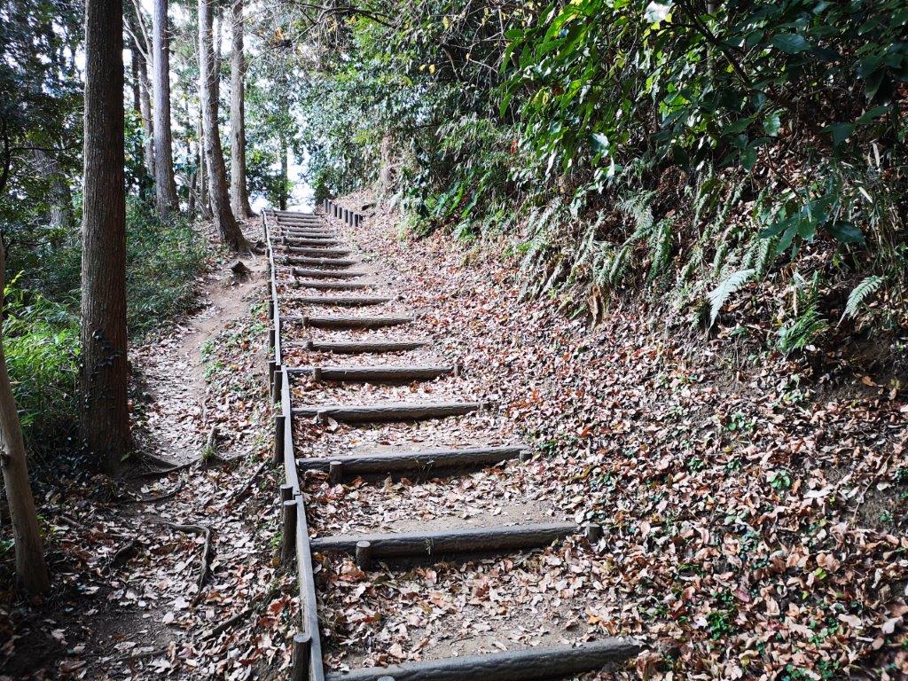 Since today’s hike was relatively short, I arrived at the station around noon and started with some soba at the nearby Jutokuan (寿徳庵). At 1pm, I was at the entrance of the Rokoku Pass hiking trail (六国峠ハイキングコース meaning “six country pass”). It took me just 15 minutes up a series of logs steps to get to the top of the ridge, and my first viewpoint of the day. Looking south, I could see the hilly outline of the Miura Alps beyond the suburbs of Yokohama city. The easy to walk trail soon reentered the forest, and followed the narrow wooded ridge through the city.