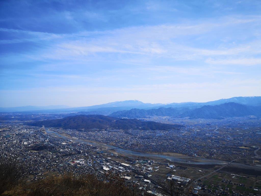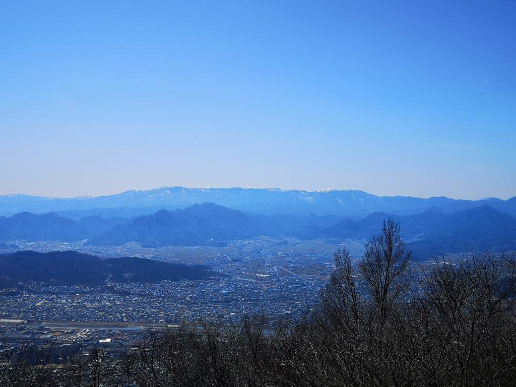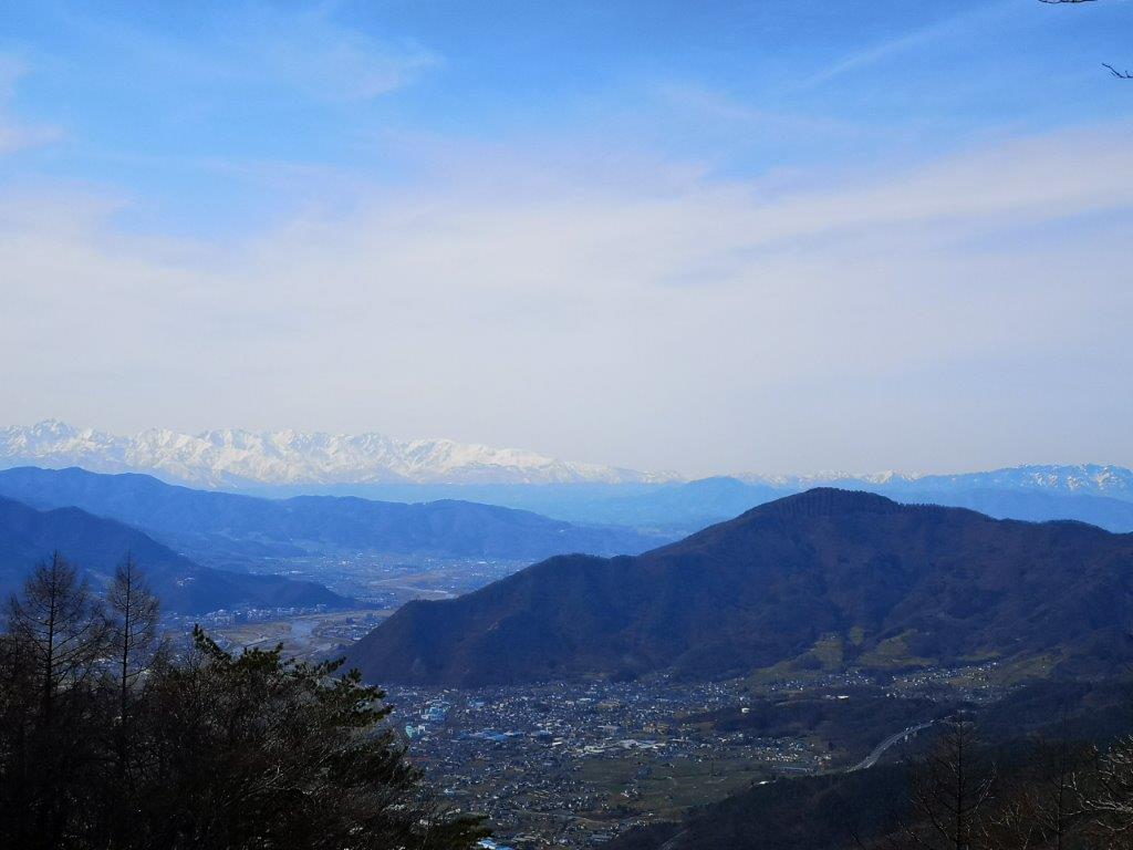 After walking up some steps, I had my first big view of the day. Half a kilometer below, Ueda city stretched away southeast along the floor of the Chikuma river valley; Mt Tateshina with its rounded top rose behind it; the flat plateau of Utsukushigahara, still topped with snow, lay directly south; looking west, I could see roughly half of the snow-capped peaks of the North Alps, the other half being cut off by the trees; Mt Fuji, 125 km away, and the peaks of the South Alps could be faintly seen beyond the Yatsugatake range.
