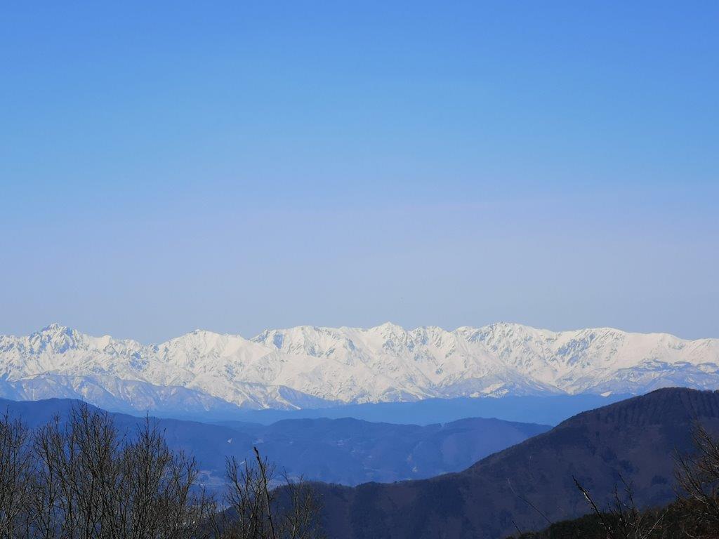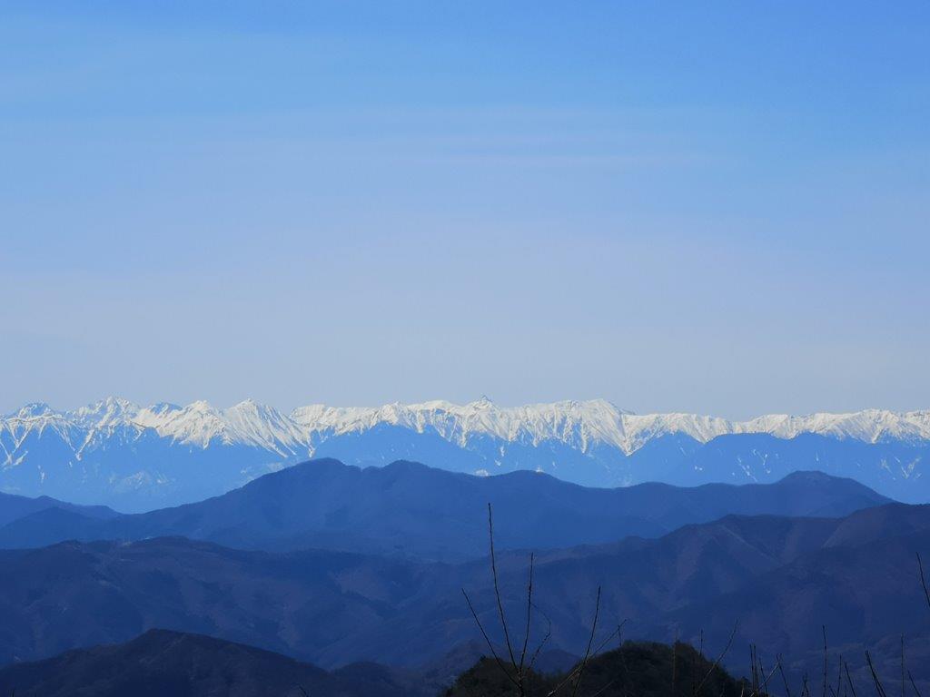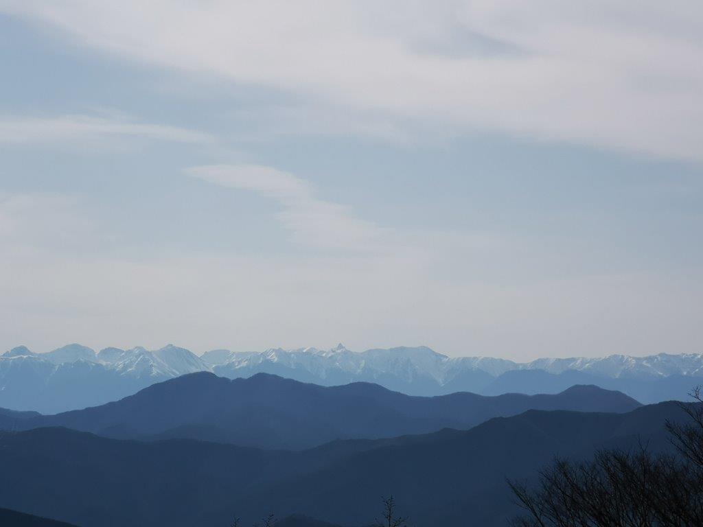 I passed by some more spectacular viewpoints of Ueda city; looking north, I could also see Mt Azuma and the peaks of Togakushi highland. At one point, I was able to observe cars moving along the highway as they exited the tunnel on the other side of the mountain. It took me an hour and half to reach the top of Mt Kokuzo (虚空蔵山 こくうぞうやま kokuuzouyama). By now, the sun had moved west and thin clouds had appeared to the south, radically changing the views. With the sun directly above, the southern part of the North Alps with the pointed tip of Mt Yari in the center, resembled a painting.