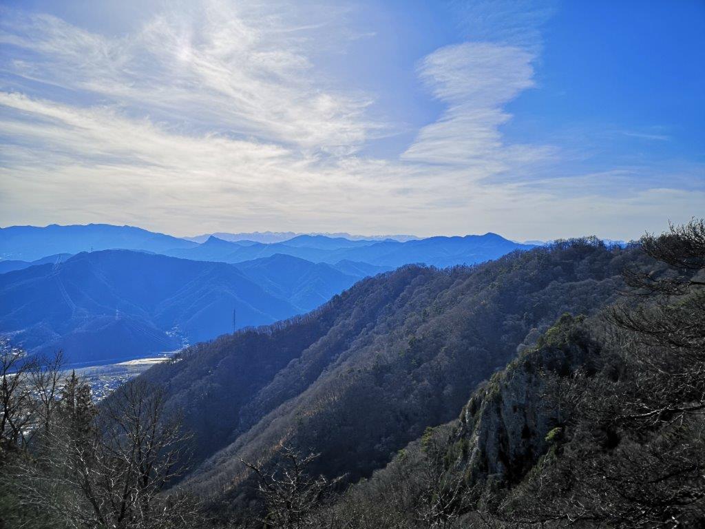 I passed by some more spectacular viewpoints of Ueda city; looking north, I could also see Mt Azuma and the peaks of Togakushi highland. At one point, I was able to observe cars moving along the highway as they exited the tunnel on the other side of the mountain. It took me an hour and half to reach the top of Mt Kokuzo (虚空蔵山 こくうぞうやま kokuuzouyama). By now, the sun had moved west and thin clouds had appeared to the south, radically changing the views. With the sun directly above, the southern part of the North Alps with the pointed tip of Mt Yari in the center, resembled a painting.