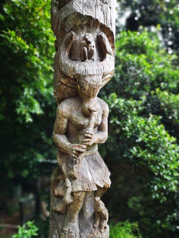 I was intrigued by a pair of wooden totem poles representing buffalo-headed humans playing flutes: I had never seen anything like it before. I continued along the easy to follow and easy to walk Fureai no Michi trail. The path rose slightly before becoming level again. At 12h30 I reached another pass. Here the trail left the mountain side and followed the ridgeline. I climbed a path crisscrossed with roots and then walked down a log staircase. At 1pm, I was at the top of Mt Atago (愛宕山), completely surrounded by trees and slightly off the main trail.