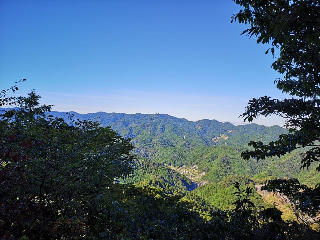 The trail rejoined the ridge top after hugging the side of the mountain for a short while. This was one of the best sections of the hike: I saw no one along the narrow ridgeline as it rose and dipped, twisted left and right through a mixed forest. The surrounding vegetation was sparse and bright green under the afternoon sun, the complete opposite of the previous hike through lush dark forest. At 3pm a steep slope, almost like a cliff, appeared on the left – a rope had been added to prevent accidents. Occasionally I had a glimpse of the Agano valley through the trees. At one point, I thought I could even make out the house of David Niehoff of Kanto Adventures on the Green line directly opposite.