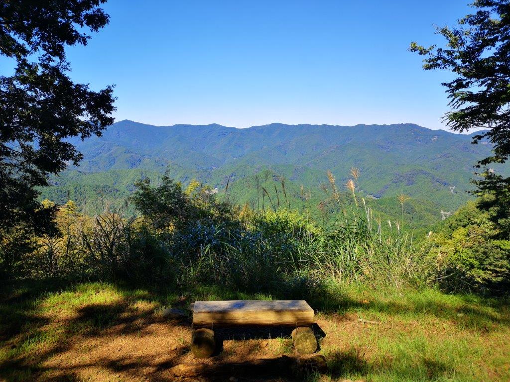 The trail rejoined the ridge top after hugging the side of the mountain for a short while. This was one of the best sections of the hike: I saw no one along the narrow ridgeline as it rose and dipped, twisted left and right through a mixed forest. The surrounding vegetation was sparse and bright green under the afternoon sun, the complete opposite of the previous hike through lush dark forest. At 3pm a steep slope, almost like a cliff, appeared on the left – a rope had been added to prevent accidents. Occasionally I had a glimpse of the Agano valley through the trees. At one point, I thought I could even make out the house of David Niehoff of Kanto Adventures on the Green line directly opposite.